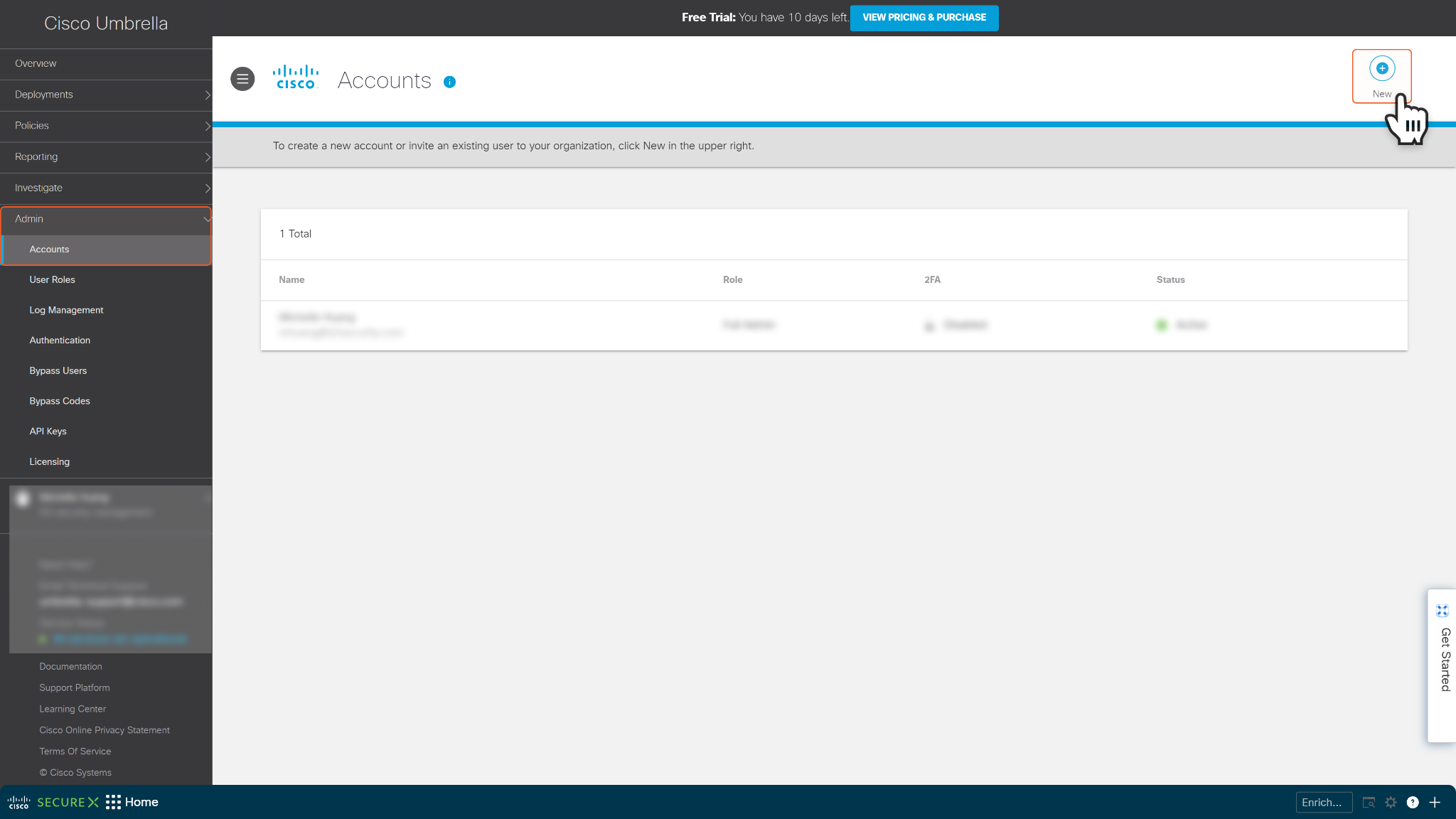 Navigate to Admin > Accounts, then click + New button in the top right corner of the screen to create a new user.