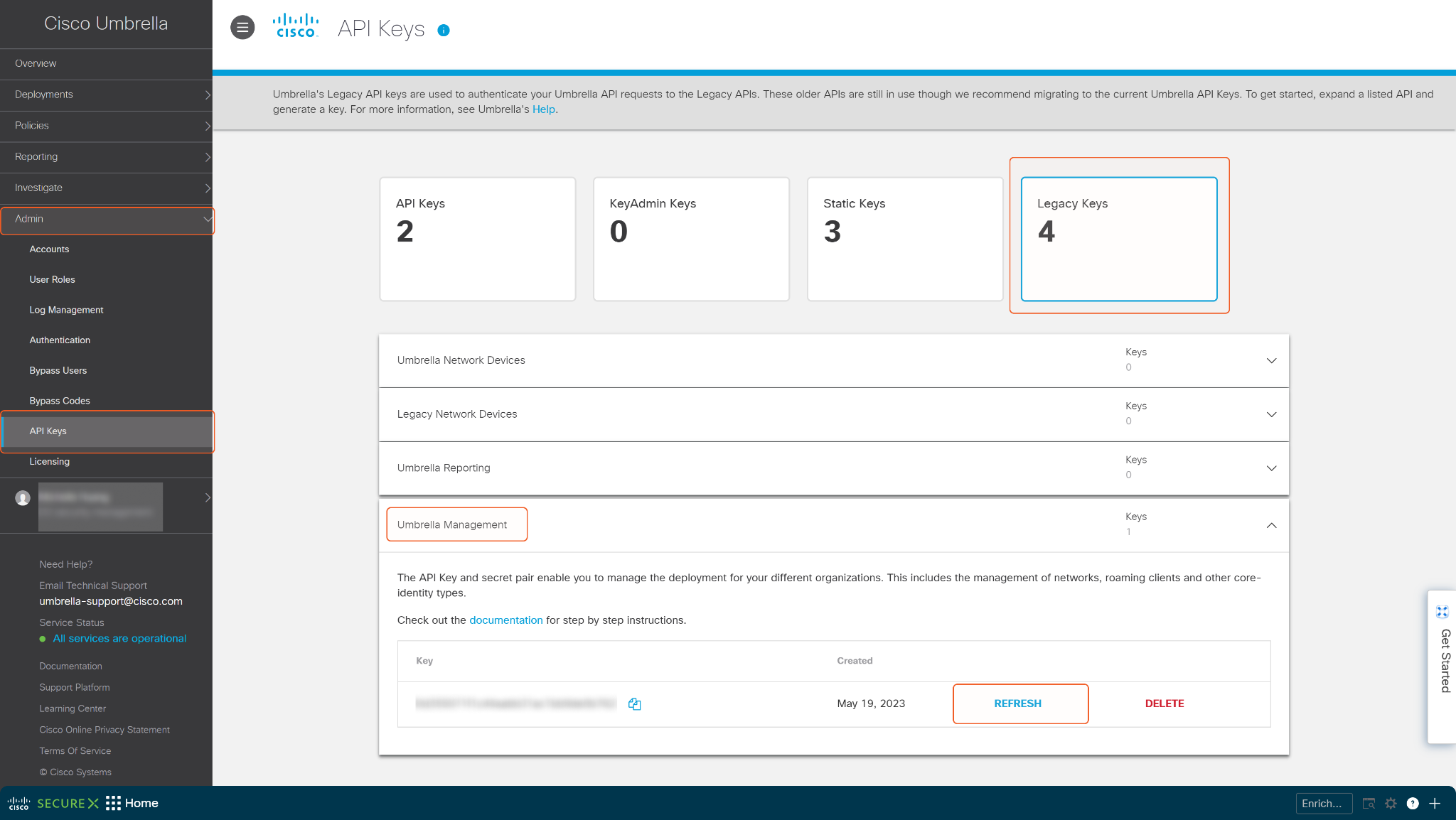 Navigate to Admin > API Keys, then click the Legacy Keys card and select Umbrella Management.