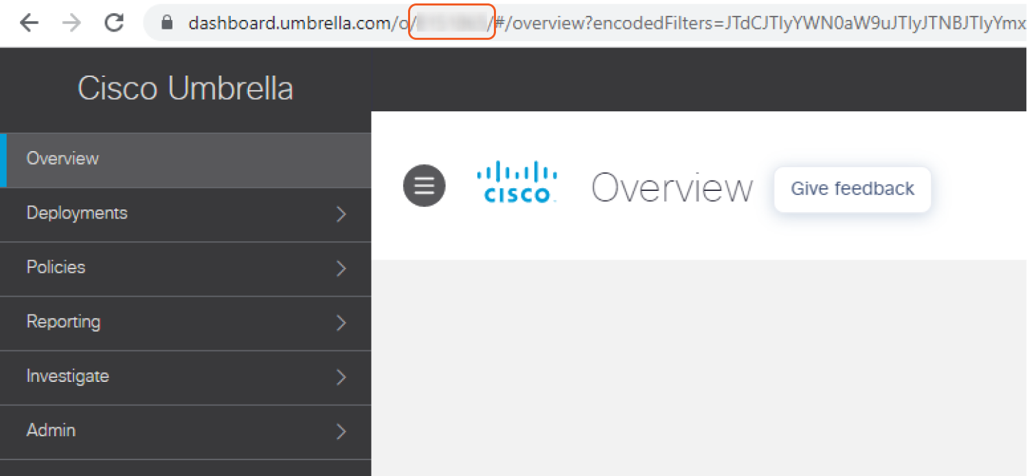 After signing in to the Cisco Umbrella Enforcement portal, locate the Organization ID in the URL https://dashboard.umbrella.com/o/<OrgID>/#/<page>, where <OrgID> is the organization’s unique identifier.