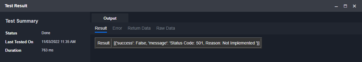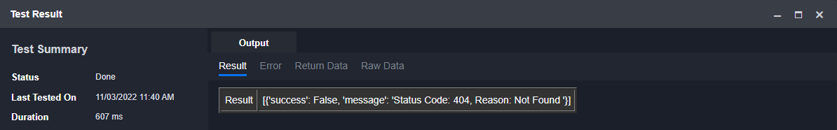 If the Return Data is Failed, an Error tab will appear in the Test Result window.