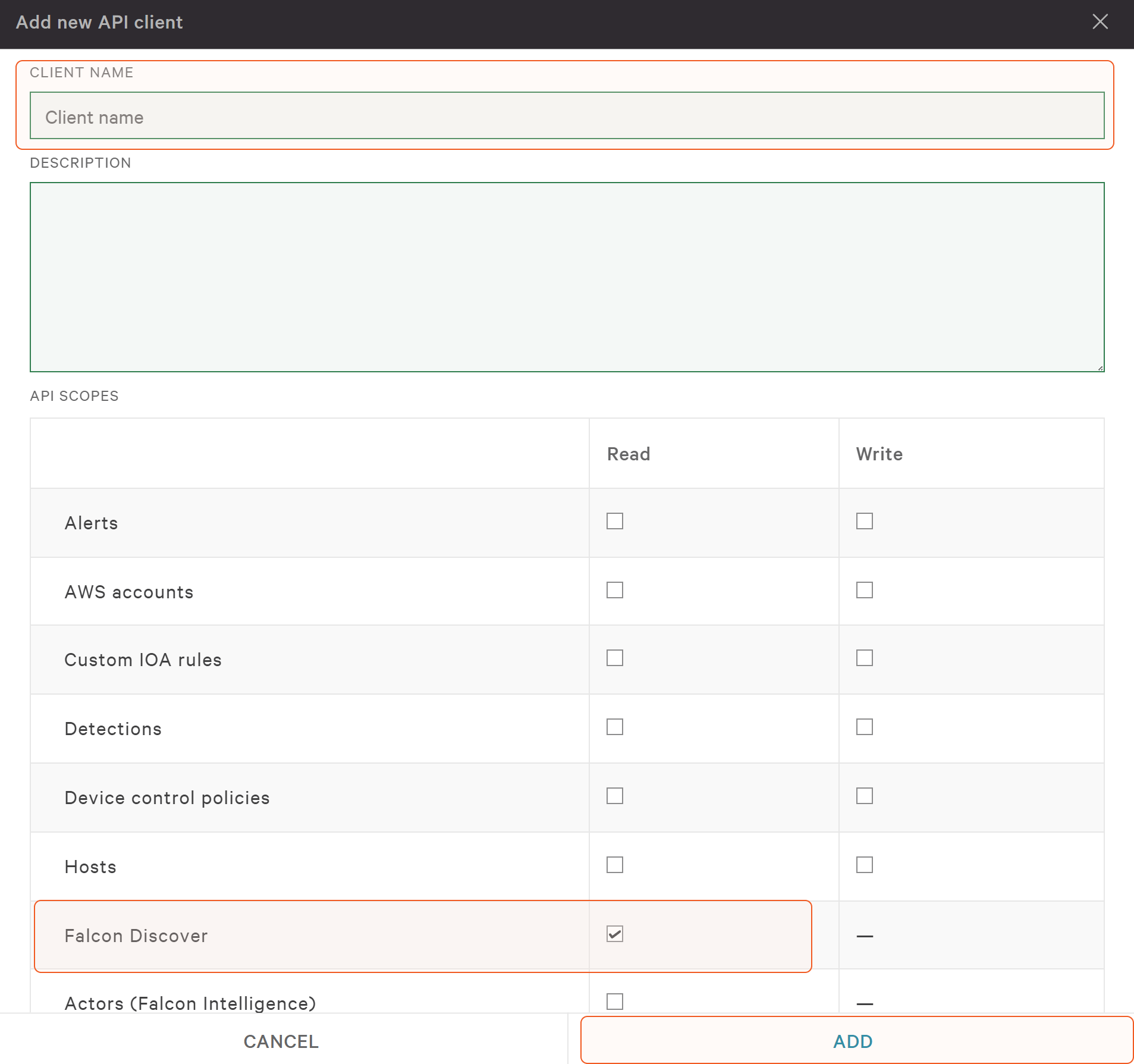The Add new API client will appear. Input a Client Name and a description (optional). Select the Falcon Discover Read permission. Click Add.