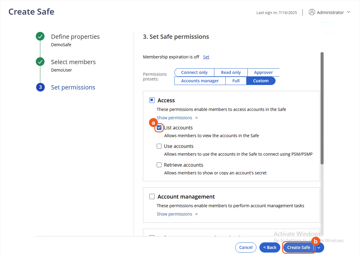 Filter | Optional | Filters accounts using properties such as safeName and modificationTime. Multiple filters can be combined using the AND operator. | safename eq partner AND modificationTime gte 1747426300 |