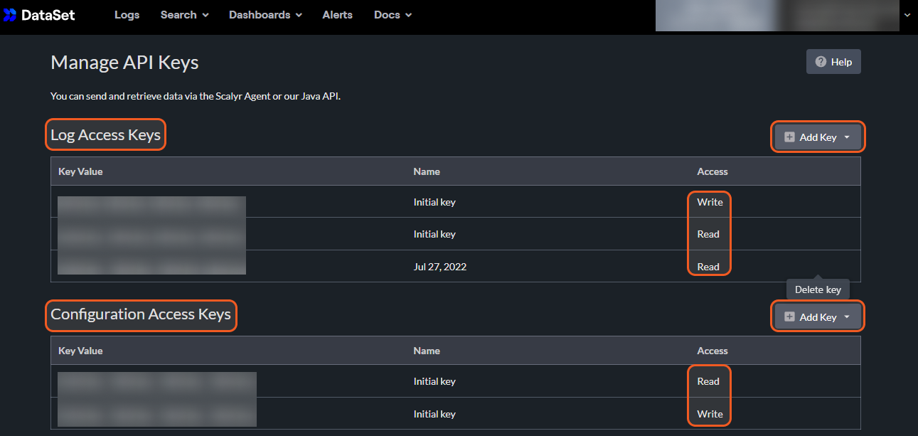 You may click the Add Key button to choose to create Log Access Keys and Configuration Access Keys with read or write access. Please refer to the Permission Requirements for the scope needed for each command.