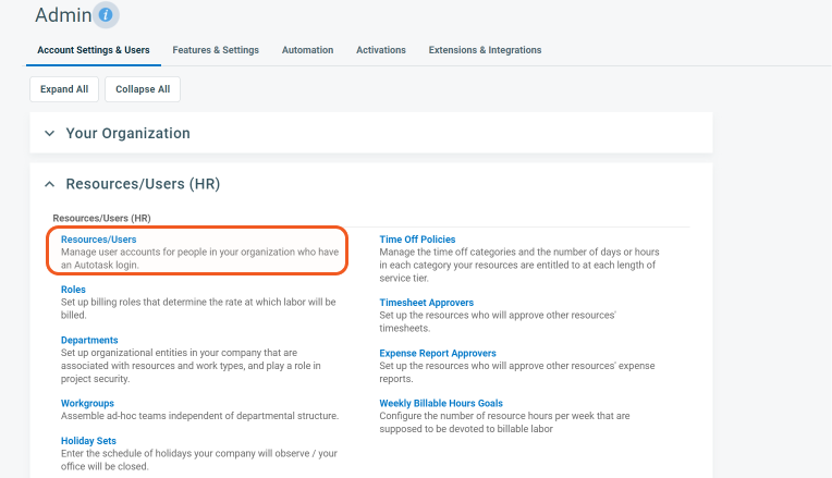Under the Account Settings & Users tab, open the Resources/Users (HR) section.