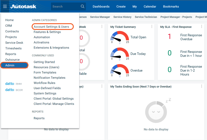 Log in to Datto Autotask PSA at https://webservices2.autotask.net.