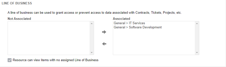 Select "General > IT Services" and "General". Select the right Line of Business pairings for this user and click the right arrow. The pairings will move to the Associated tab.