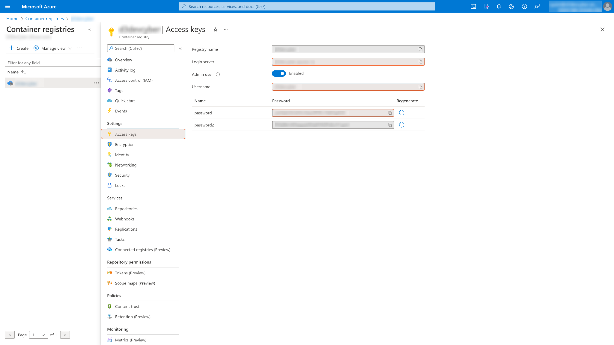 Under your selected registry, click Access keys. You will see the Login server, Username, and Password fields on the right.