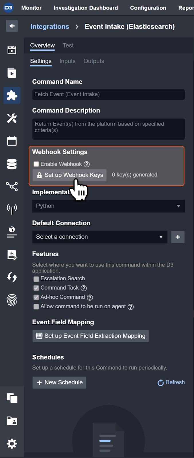 The example below demonstrates the process of creating a new Webhook in D3 SOAR and Elasticsearch.