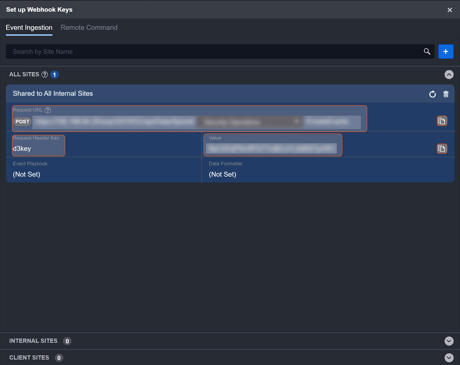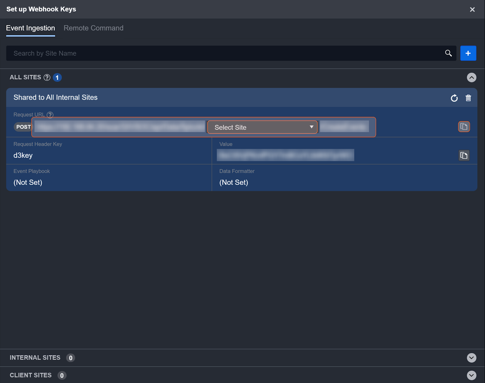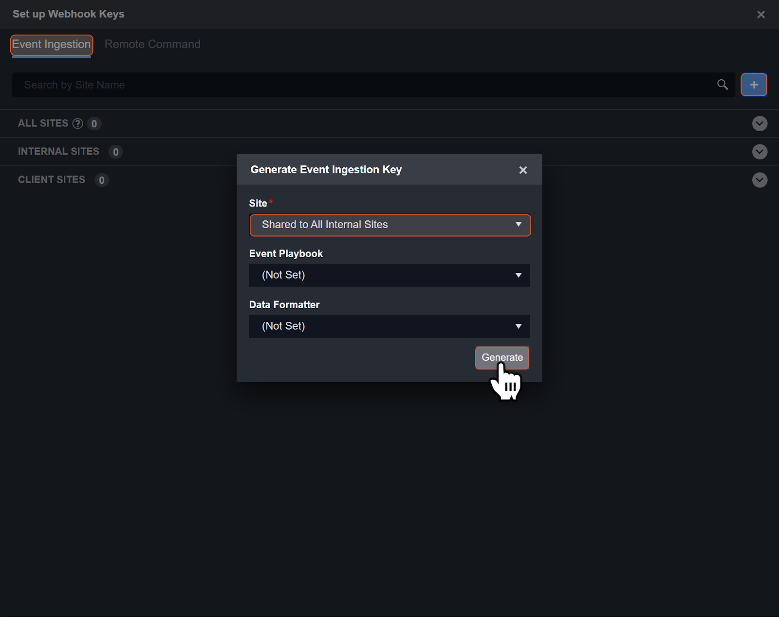 Under Event Ingestion, Click +. Select the site for the webhook integration, then click Generate.