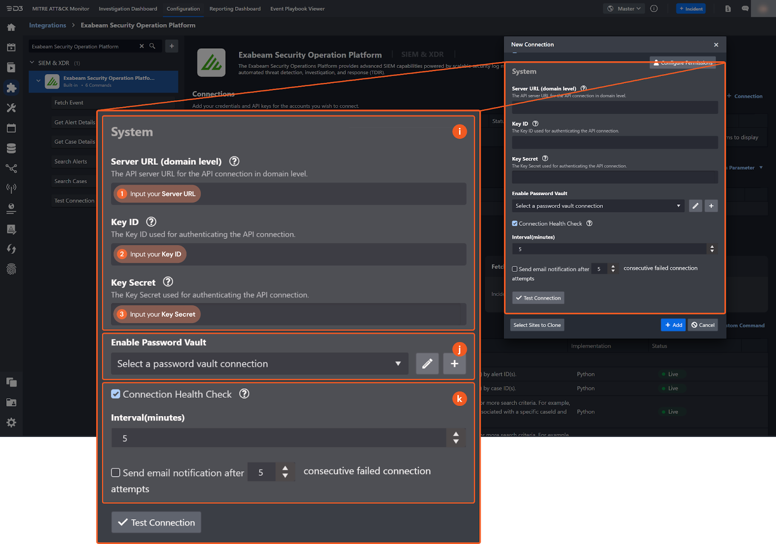 3. Input the Key Secret. Refer to step 4 of Configuring Exabeam Security Operations Platform to Work with D3 SOAR.Enable Password Vault: An optional feature that allows users to take the stored credentials from their own password vault. Refer to the password vault connection guide if needed.