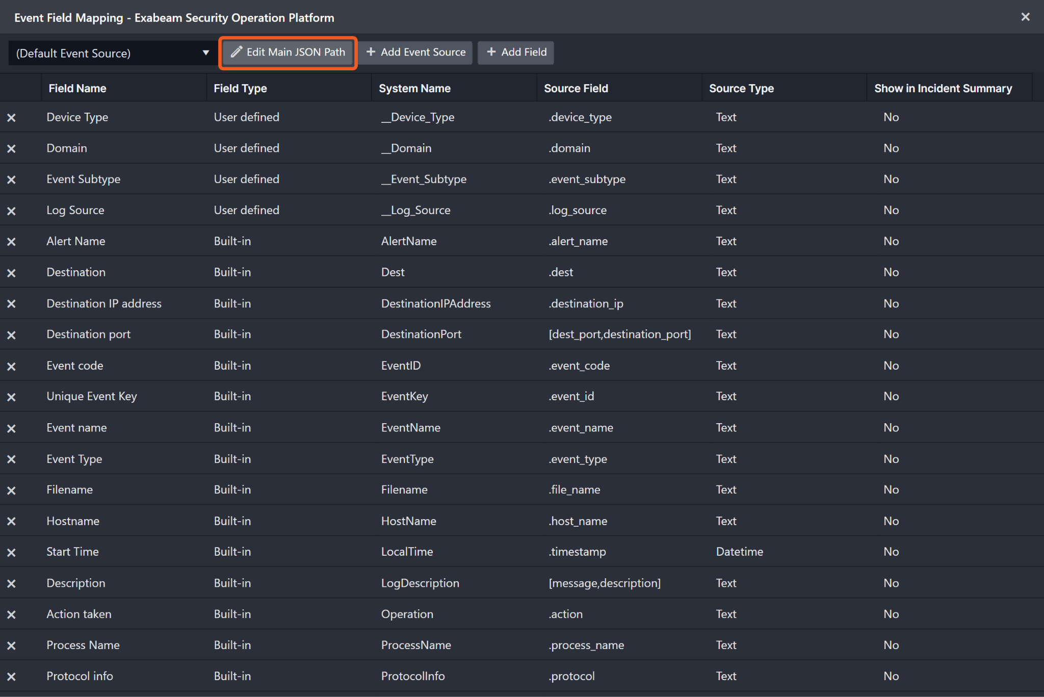 As a system integration, the Exabeam Security Operations Platform integration has some pre-configured field mappings for default field mapping.