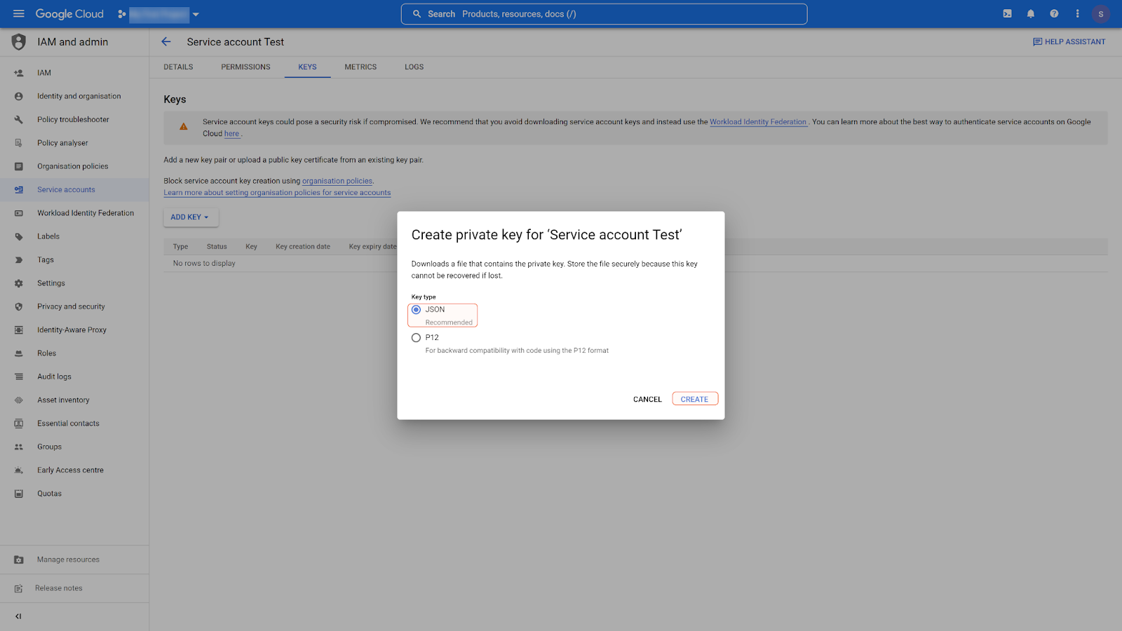 Choose JSON as the key type, then click CREATE.