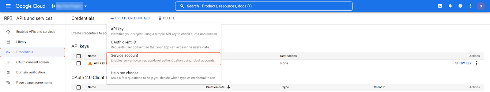 Click + CREATE CREDENTIALS, and select Service account.