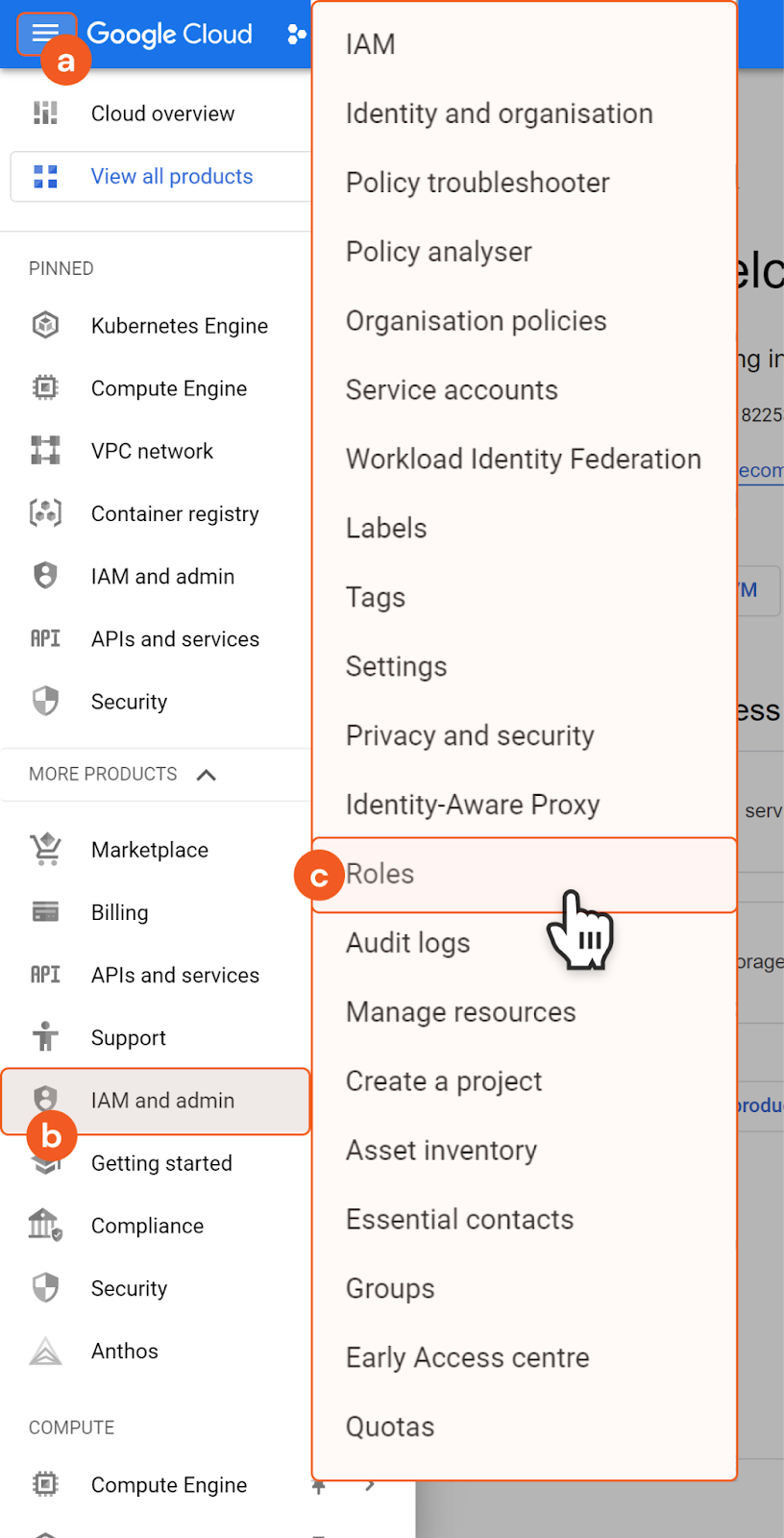 Click on the hamburger menu found on the top left corner to reveal the sidebar menu. Click IAM and admin, then Roles.