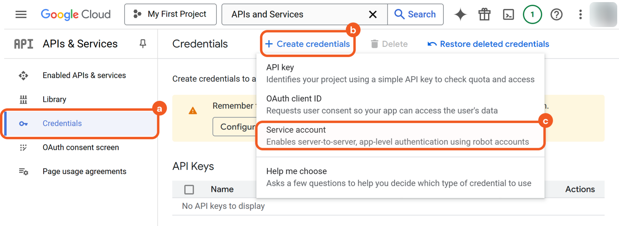 Navigate to Credentials, click the + Create credentials button, then select the Service account option.