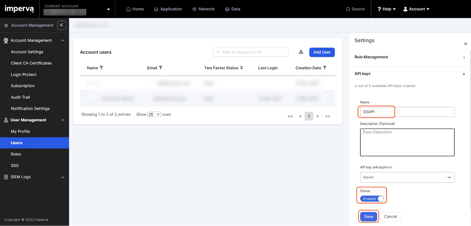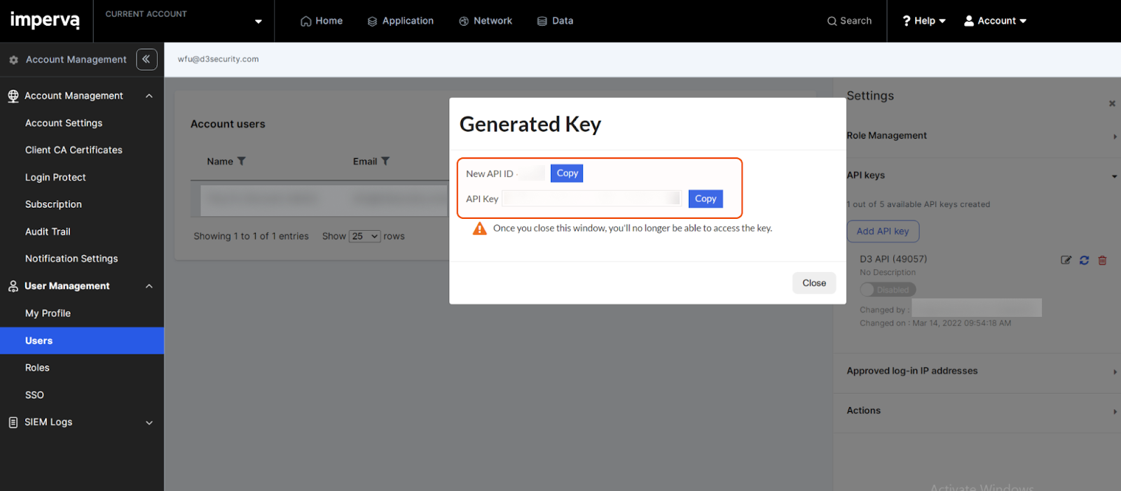 Copy and store the API ID and API Key. Refer to step h sub-steps 1 and 2 in Configuring D3 SOAR to Work with Imperva Cloud WAF (Incapsula WAF).