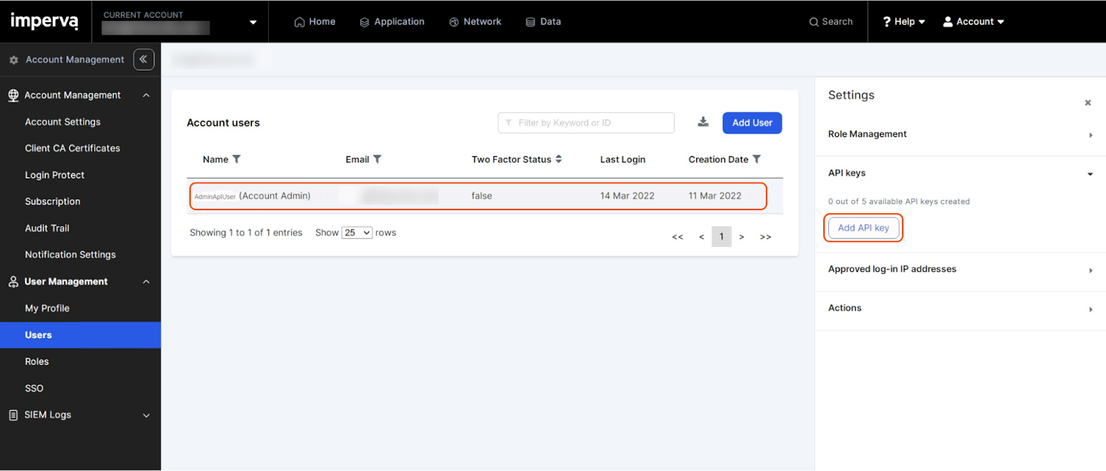 Each endpoint in the Imperva Cloud WAF (Incapsula WAF) API requires a certain permission scope. As Imperva Cloud WAF (Incapsula WAF) is using role-based access control (RBAC), the API ID and API Key are generated based on a specific user account and the application. Therefore, the command permissions are inherited from the user account’s role.