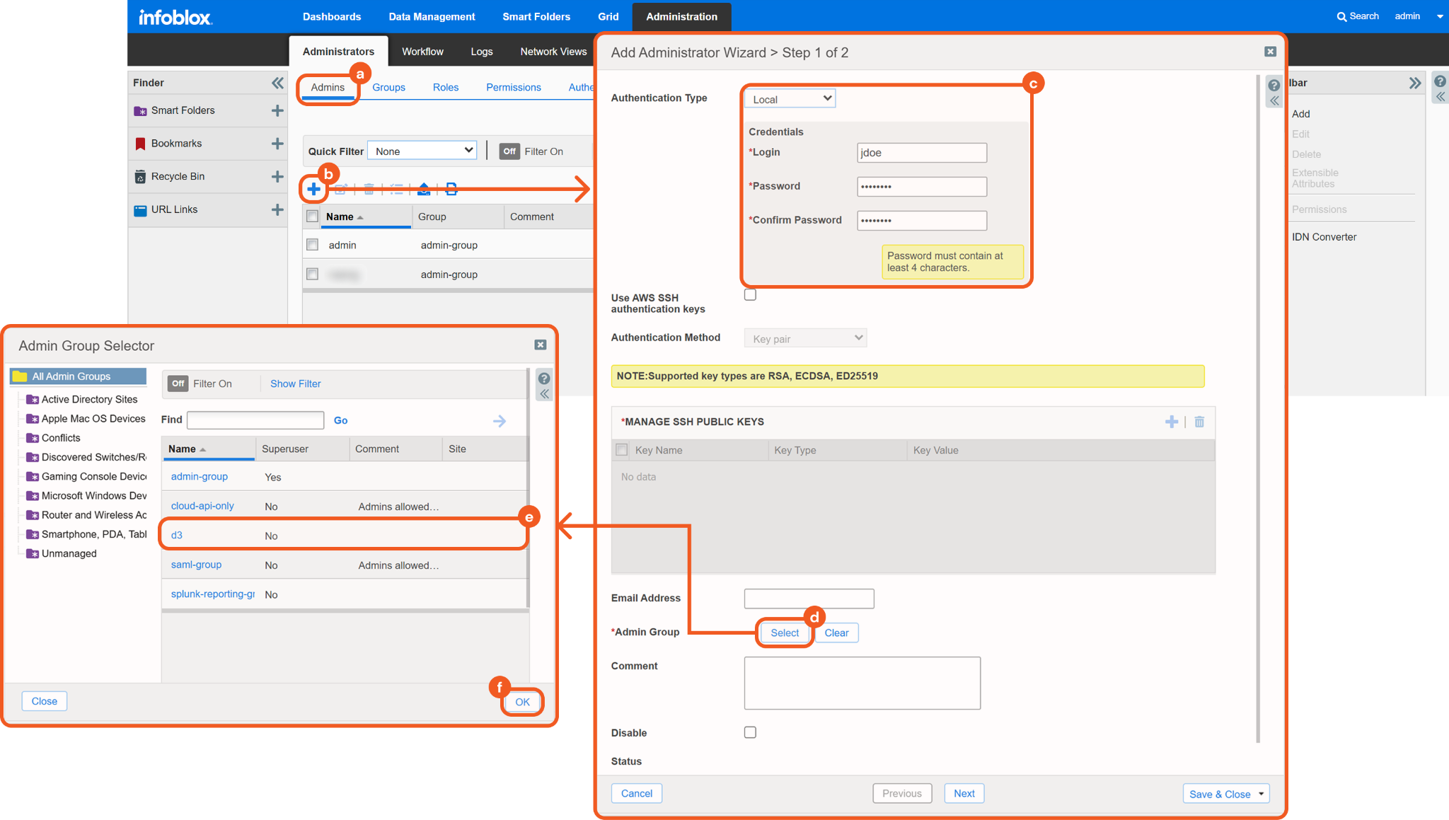 Configure the admin's login method and credentials. Refer to sub-steps 2 and 3 under step 3i in Configuring D3 SOAR to Work with Infoblox NIOS.