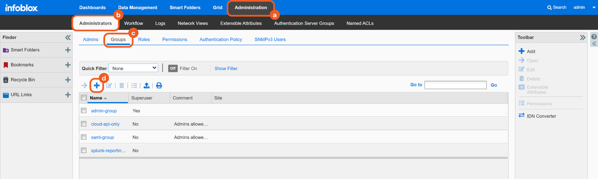 Navigate to Administration > Administrators > Groups, then click the + button.
