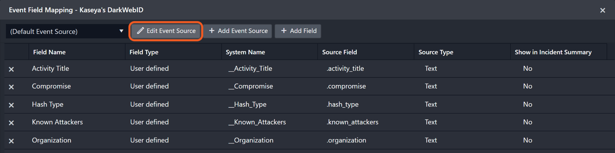 As a system integration, the Kaseya's DarkWebID integration has some pre-configured field mappings for default field mapping.