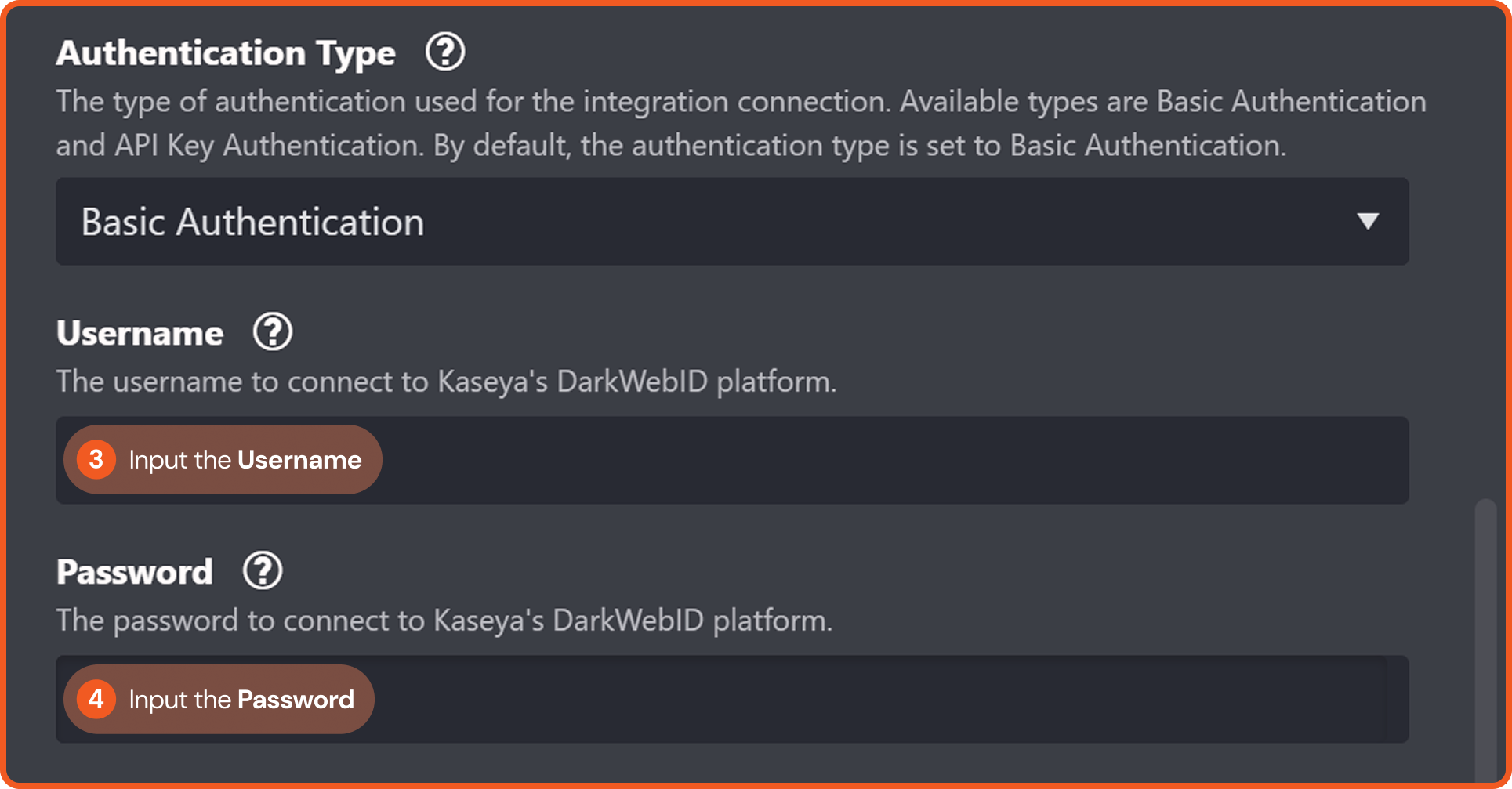 Password | The password used to authenticate with Kaseya's DarkWebID platform. | No data in Database |