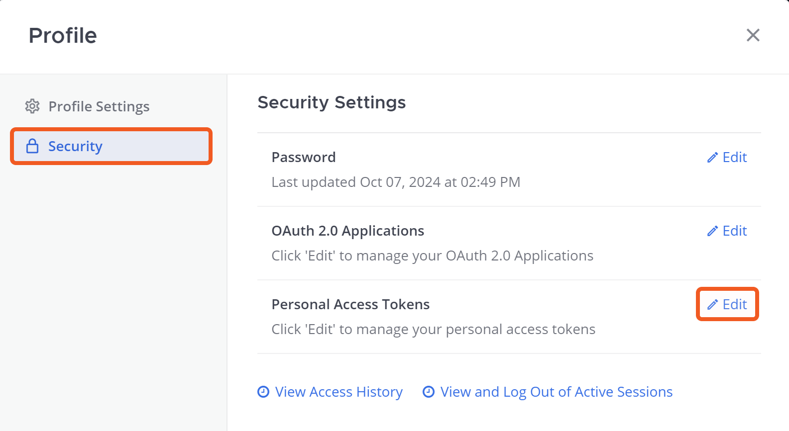 Click on the Security module on the left, then click on the Edit button in the Personal Access Tokens section.