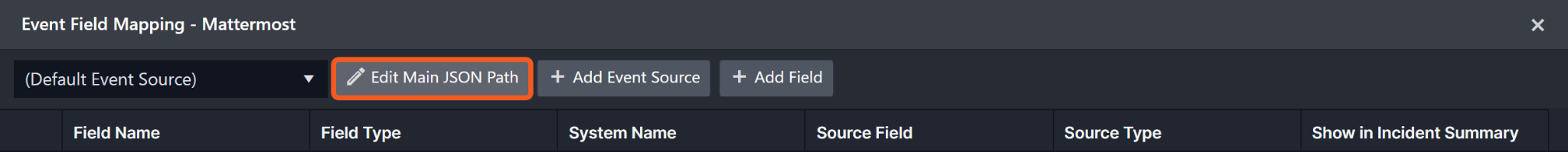 The Default Event Source is the default set of field mappings that are applied when this fetch event command is executed. For out-of-the-box integrations, you will find a set of field mapping provided by the system. Default event source provides field mappings for common fields from fetched events. The default event source has a "Main Event JSON Path" (i.e. $.) that is used to extract a batch of events from the response raw data. Click Edit Main JSON Path to view the "Main Event JSON Path".Main Event JSON Path: $