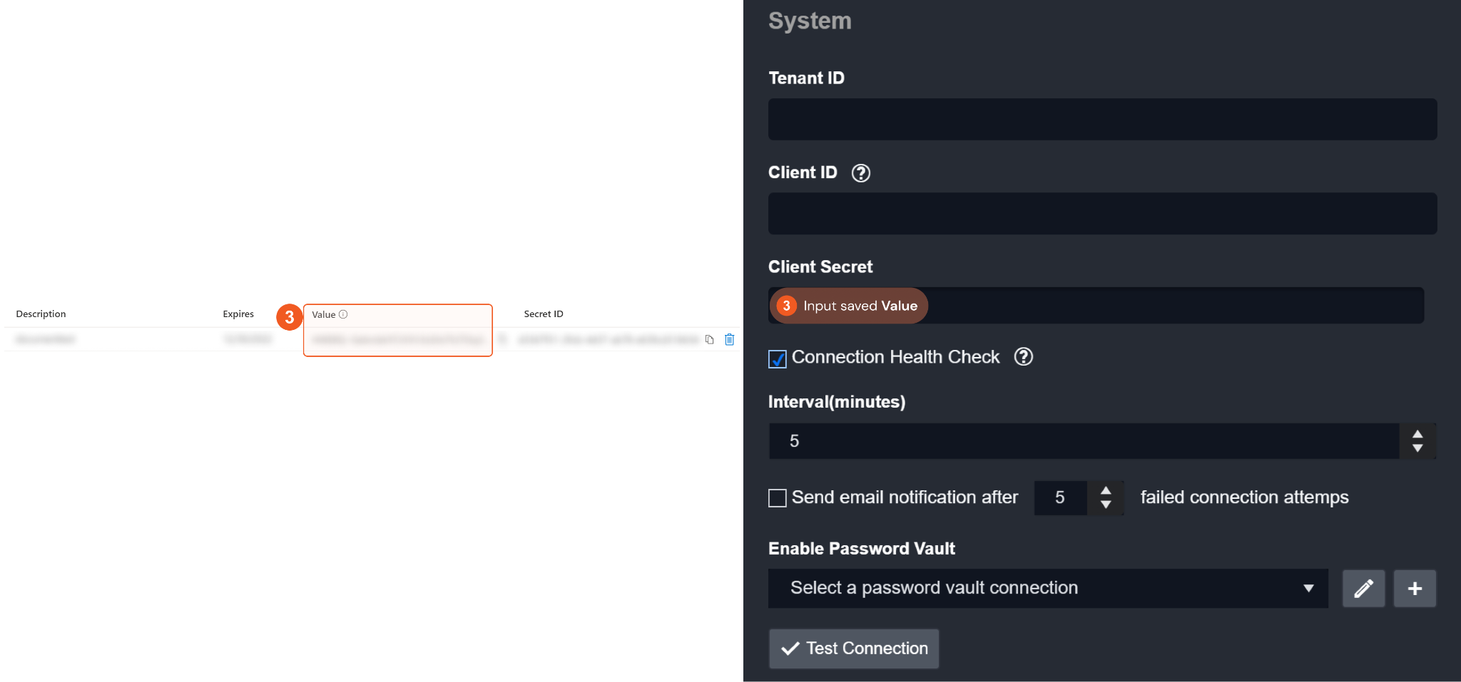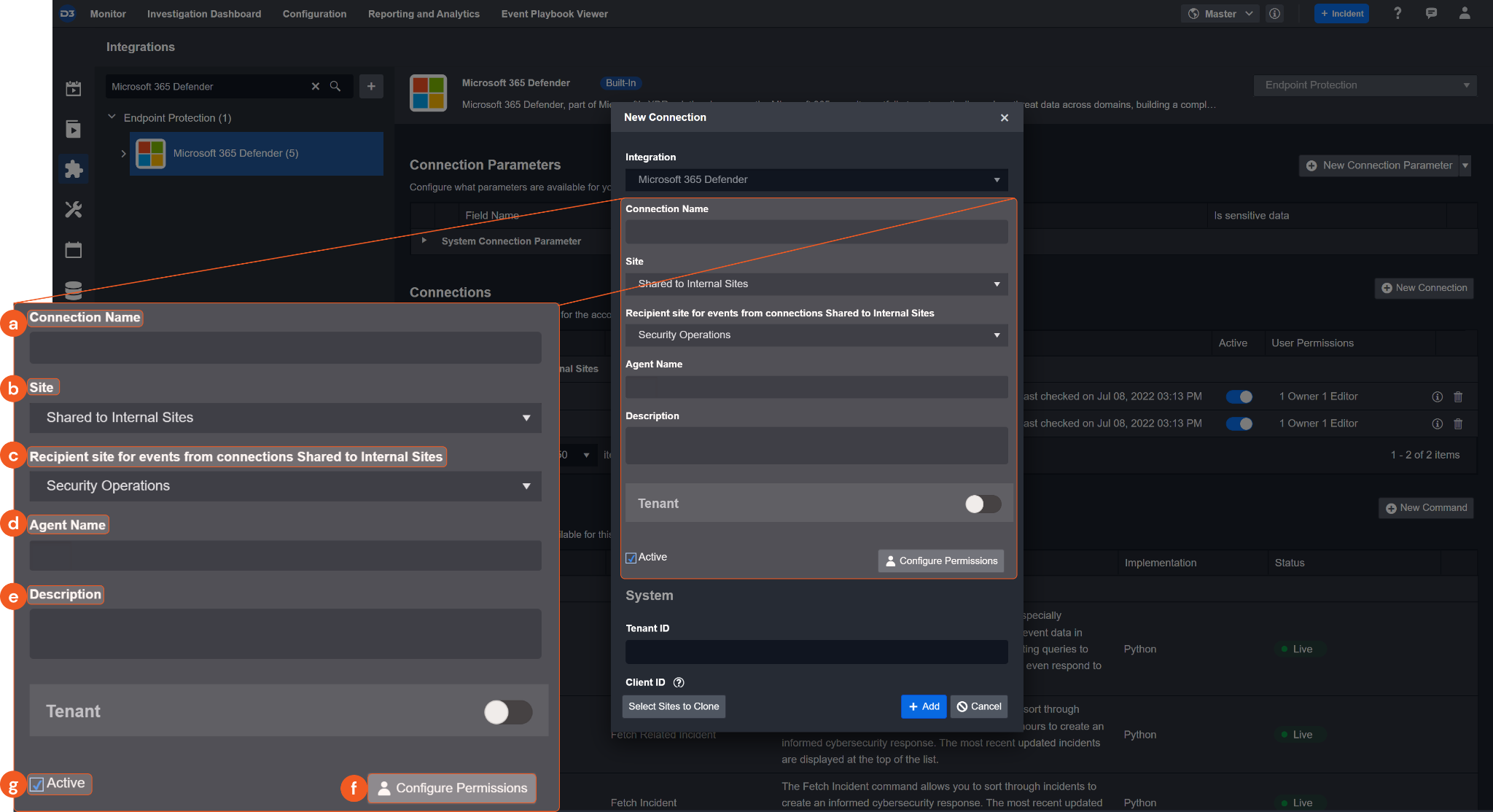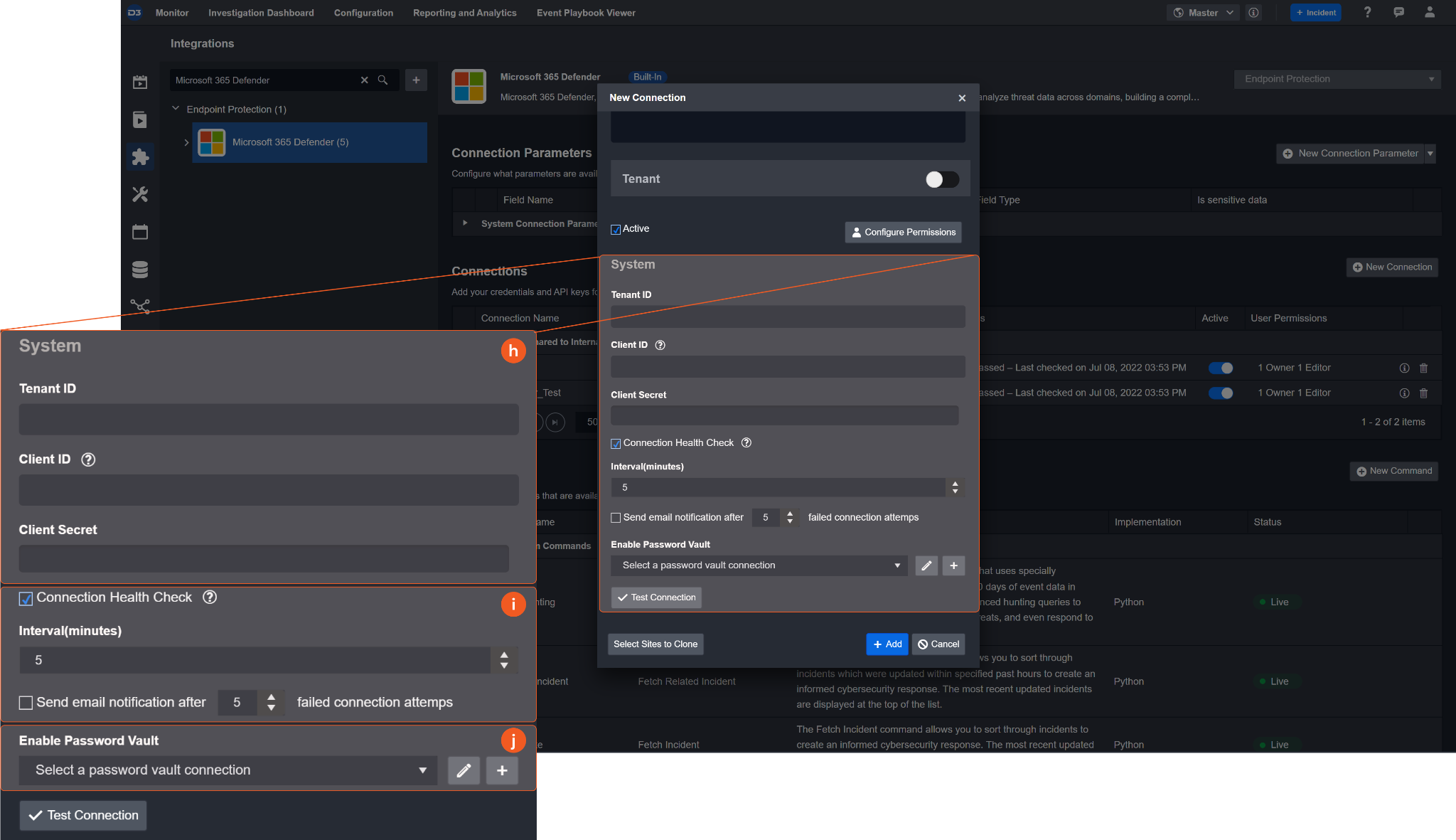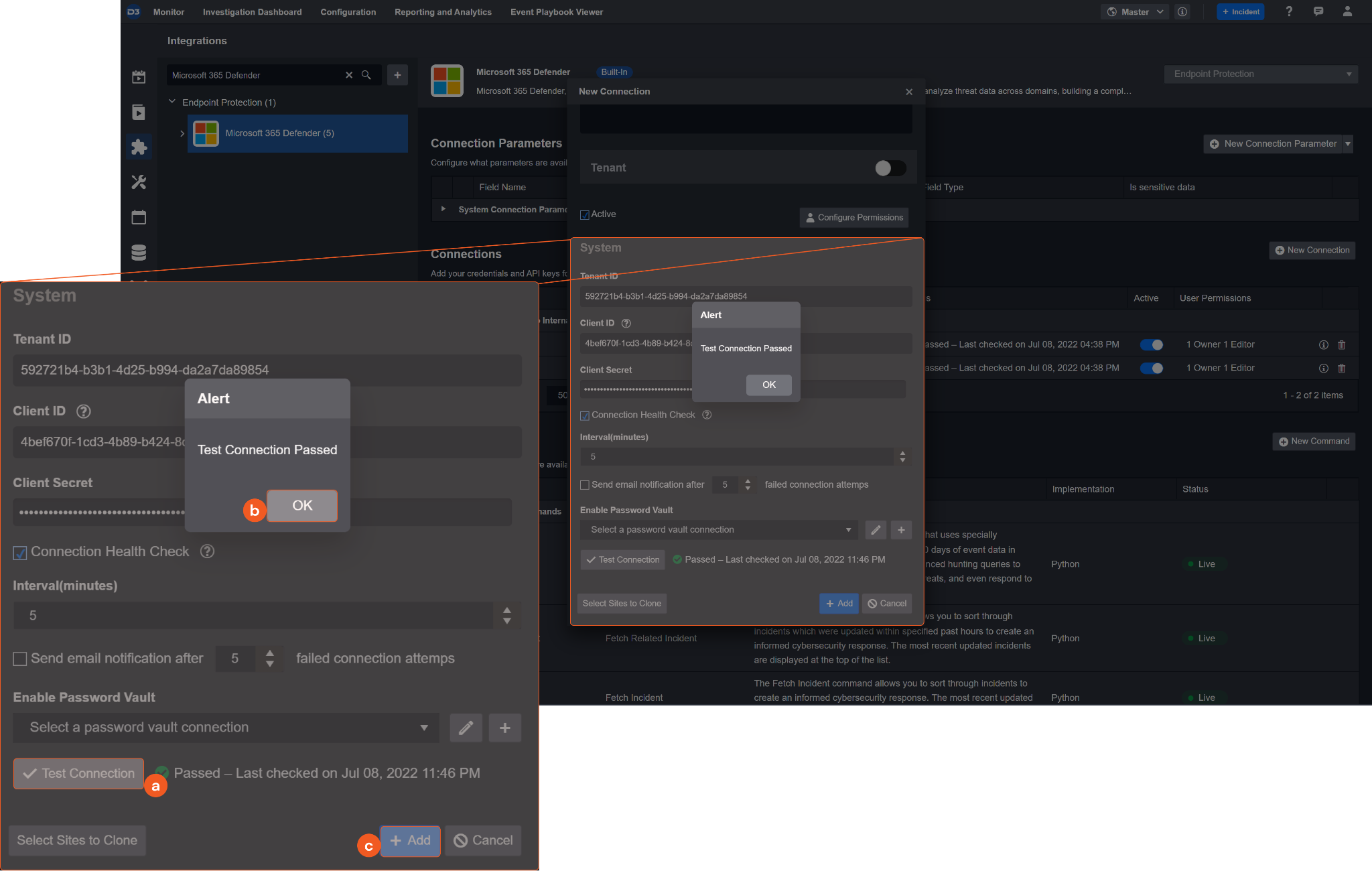 3. Input the previously saved value to the Client Secret field. Please refer to step 8 of Configuring Microsoft 365 Defender to Work with D3 SOAR.Connection Health Check: Updates the connection status you have created. A connection health check is done by scheduling the Test Connection command of this integration. This can only be done when the connection is active.