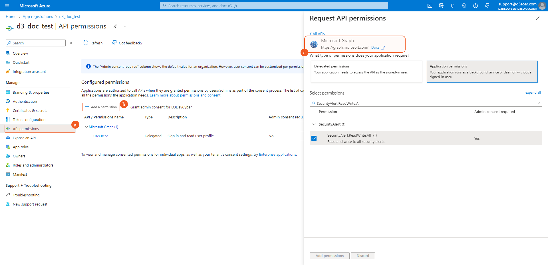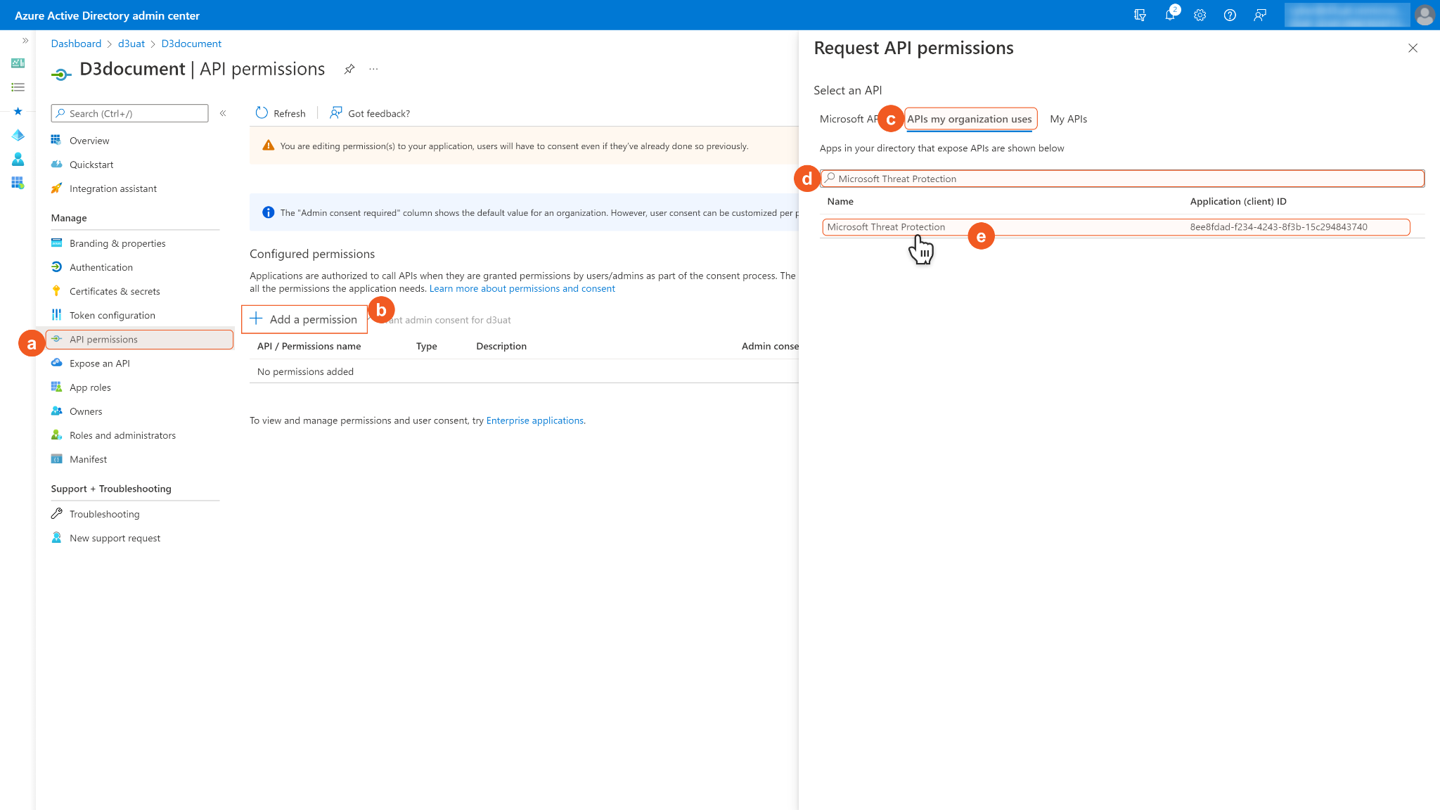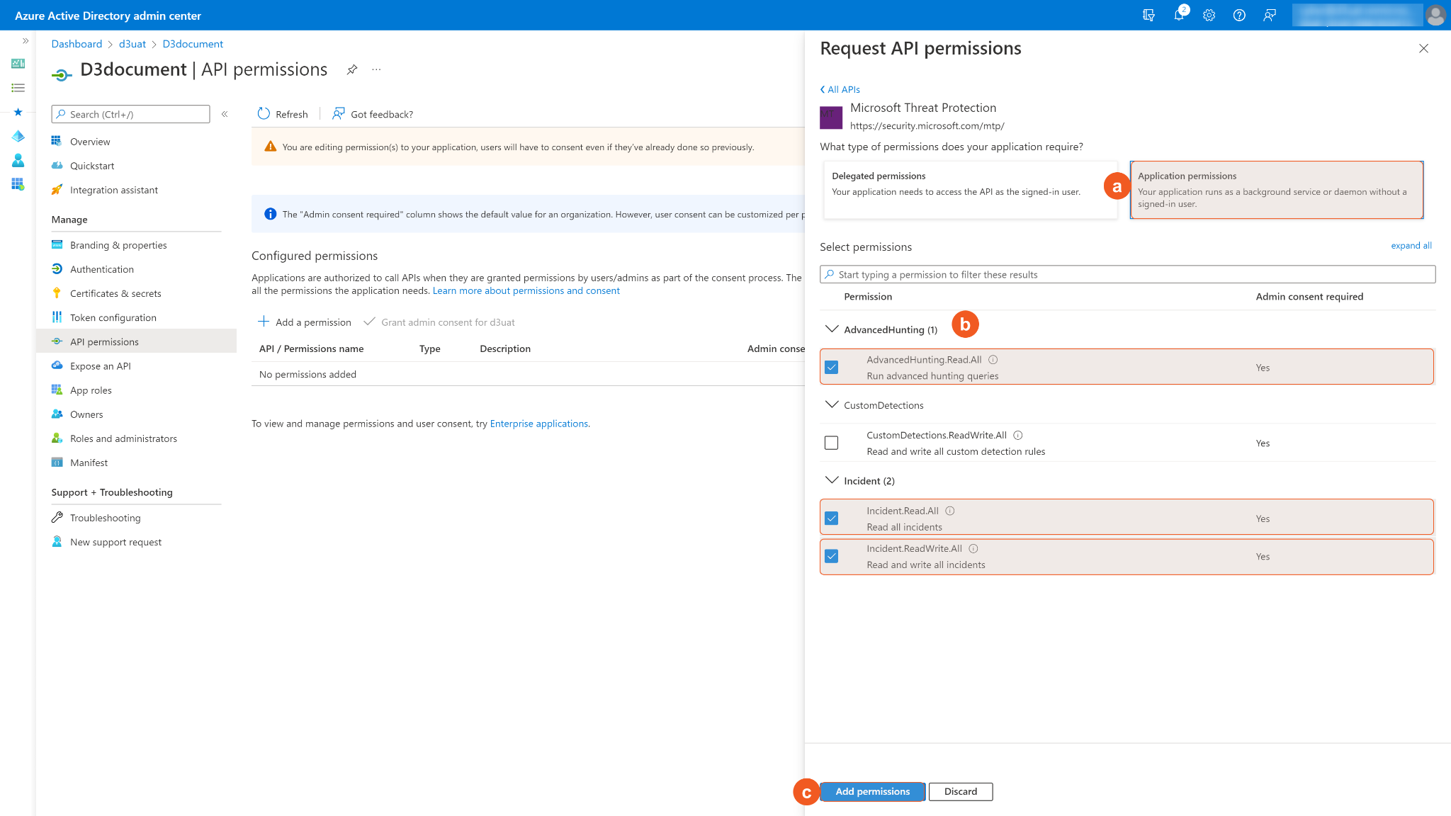 Configure the API permissions. Click API permissions on the left navigation menu, then + Add a permission. To run all commands, designated users will need to have both Microsoft Graph permissions and Microsoft Threat Protection permissions. For each command's details, please refer to the Permission Requirements section.
