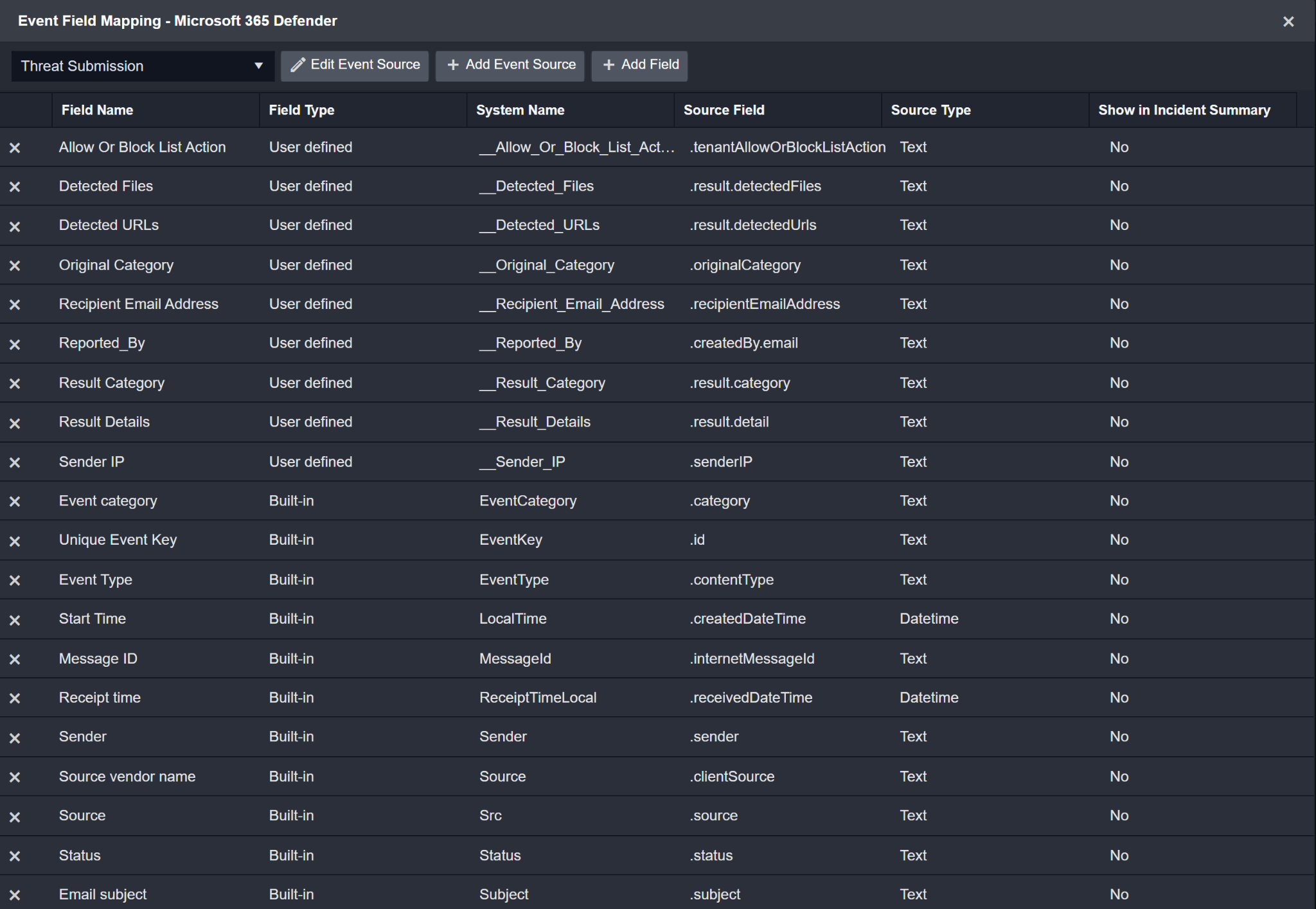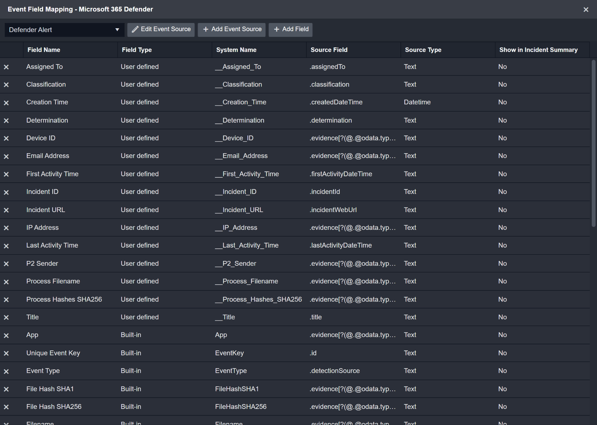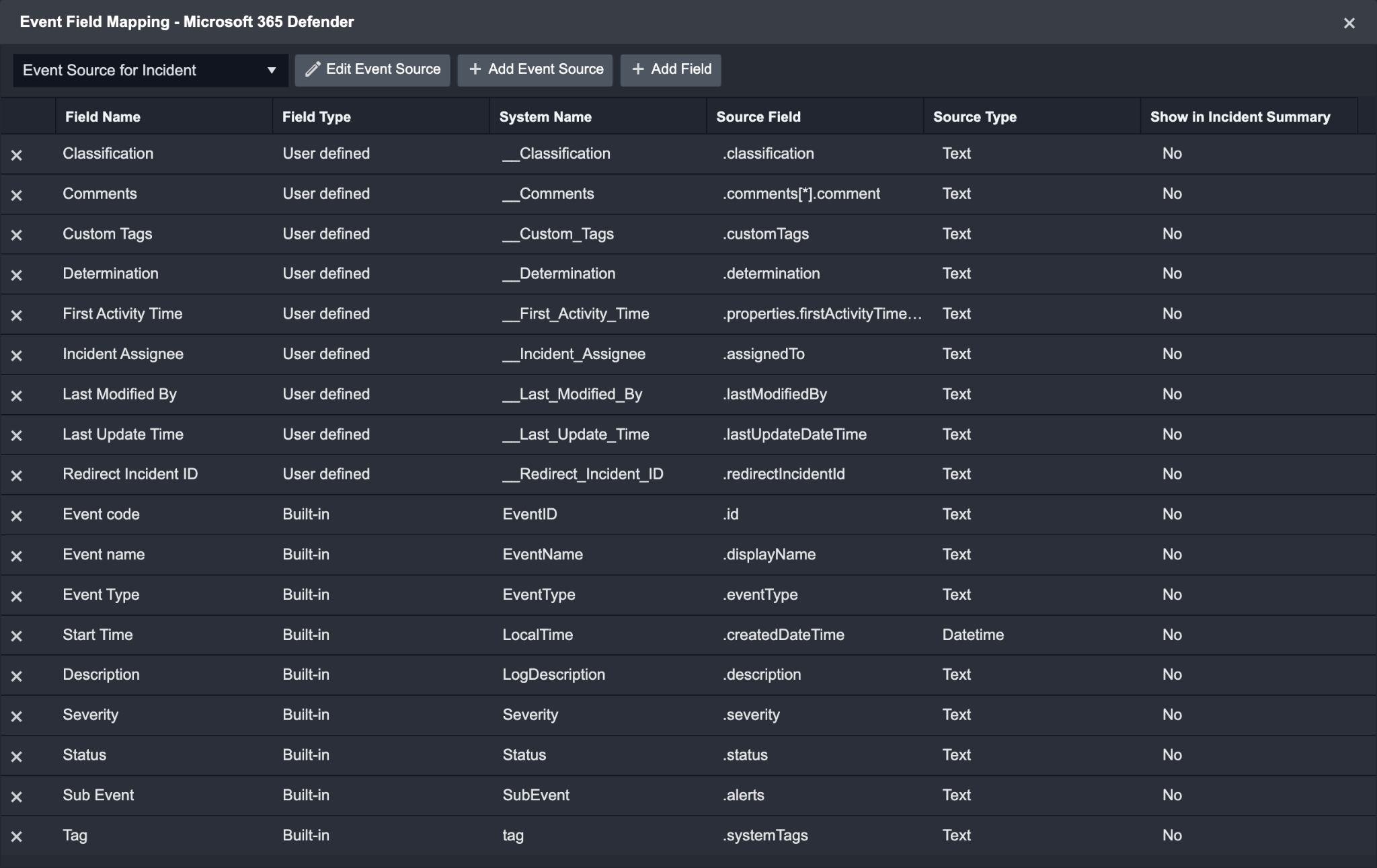 In this integration, the default incident fields in D3 SOAR are fixed with no built-in source fields. Users can specify the source fields as needed.
