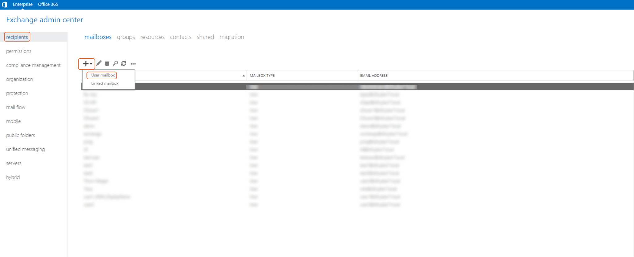 Go to Recipients and click on +. Select User mailbox to create a new user.