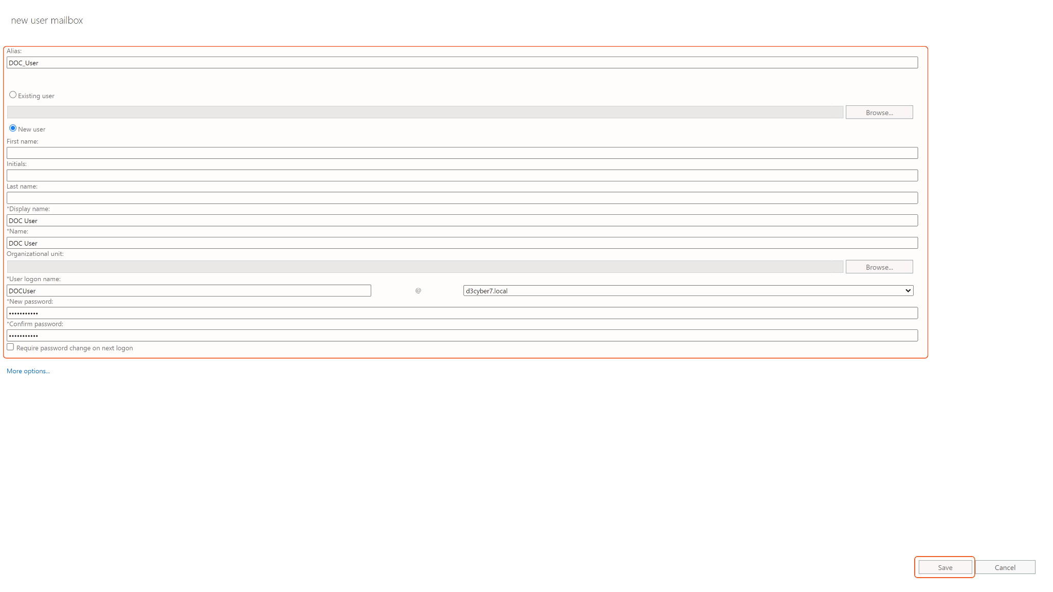 Provide the necessary information and click Save to finish creating the user. Note down the user logon name as it will be required for the D3 connection parameter (Domain & Username).
