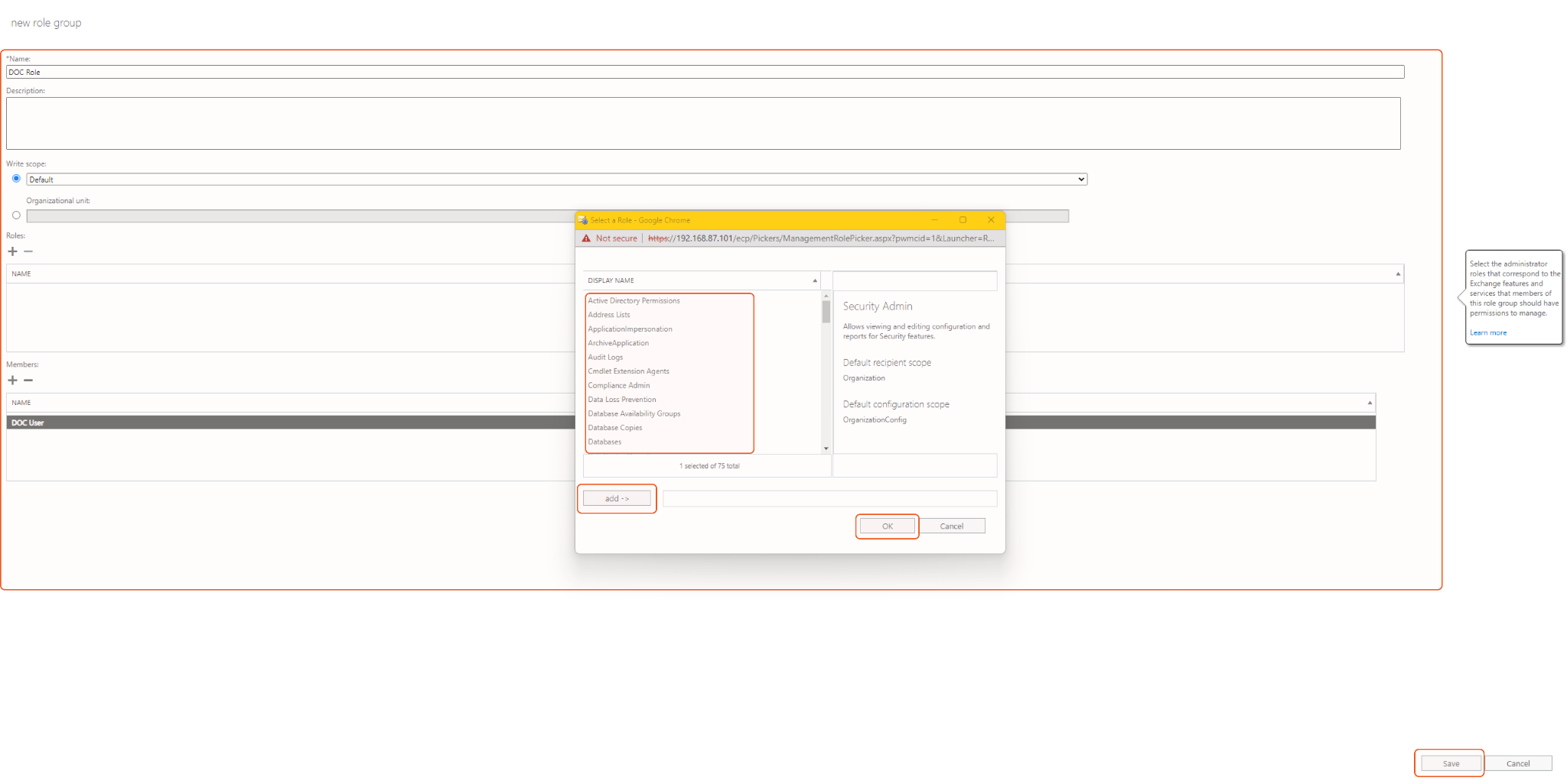Give a name to your role, then click on + under Roles. This will open a window. From the window, select the Mailbox Search role. Click Add and then OK. Repeat the same steps to select the appropriate members (choose the user you just created). Finally, click Save to save the settings.