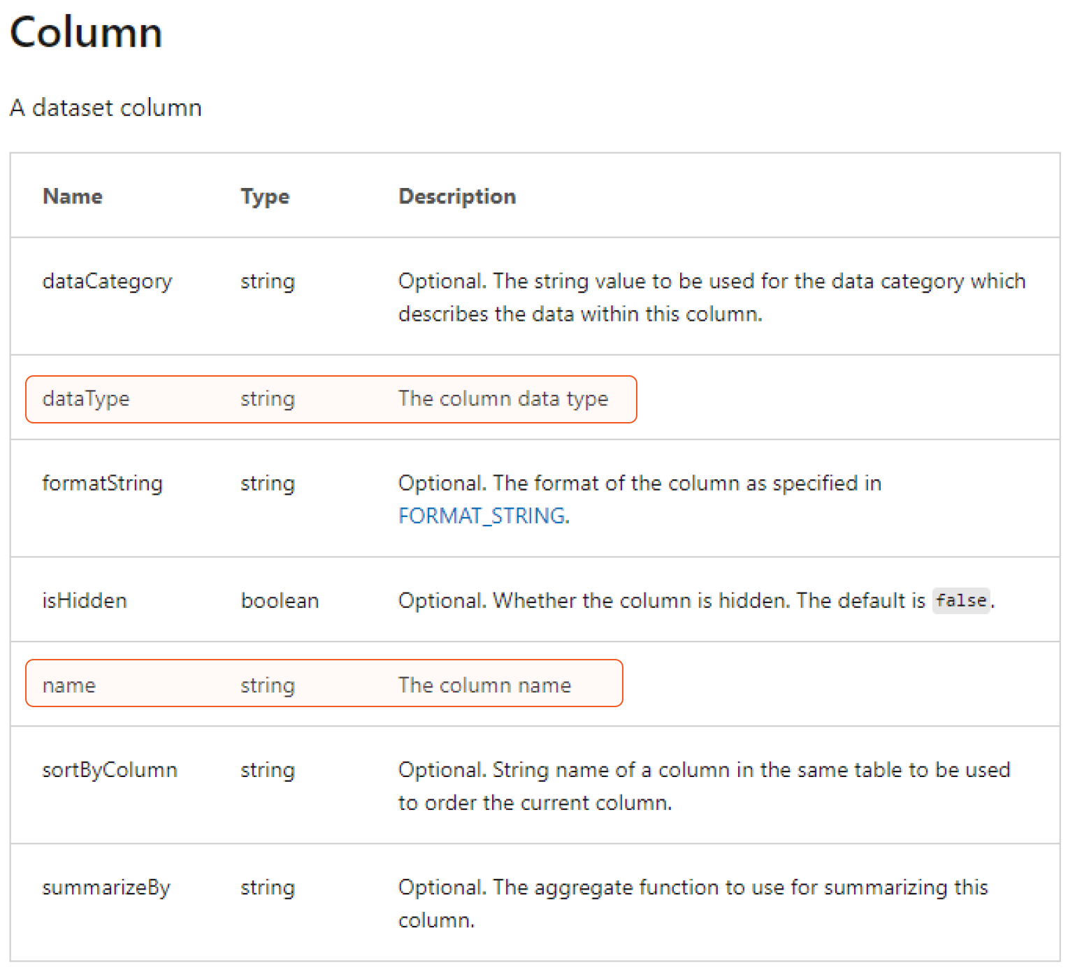 You can set the columns with the following fields. Please note dataType and name are mandatory, you must define these two fields for your created columns. Please refer to Push Datasets - Datasets GetTables - REST API (Power BI Power BI REST APIs) | Microsoft Learn from Microsoft's documentation for more details.