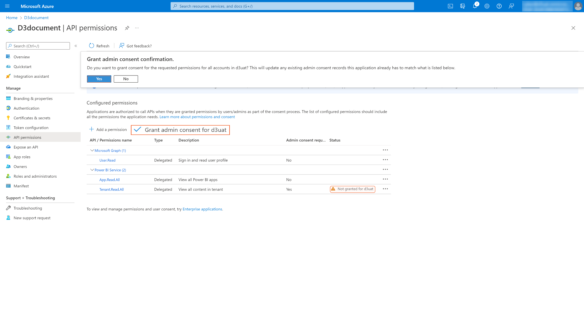 Some permissions may need to be granted admin consent for d3uat for use. Ensure Grant admin consent for d3uat is checked.
