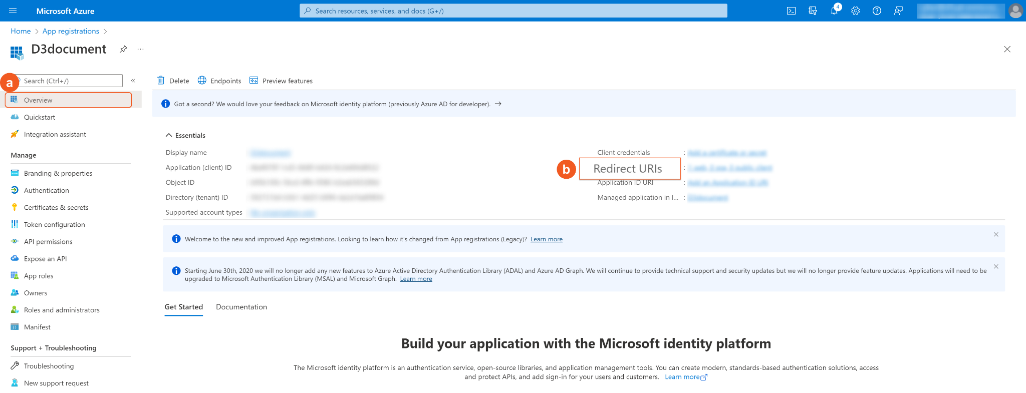 Click Overview on the left Navigation Column, then click Add a redirect URI next to Redirect URIs.