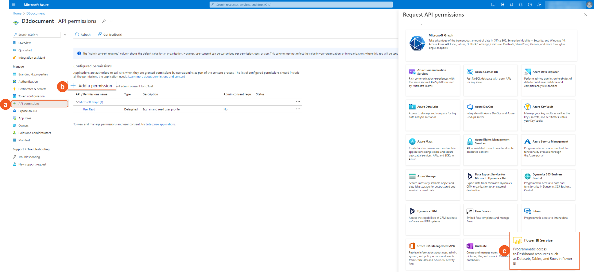 Configure the API permissions. Click API permissions on the left navigation menu,, then+ Add a permission. Finally, click Power BI Service under the Microsoft APIs tab.