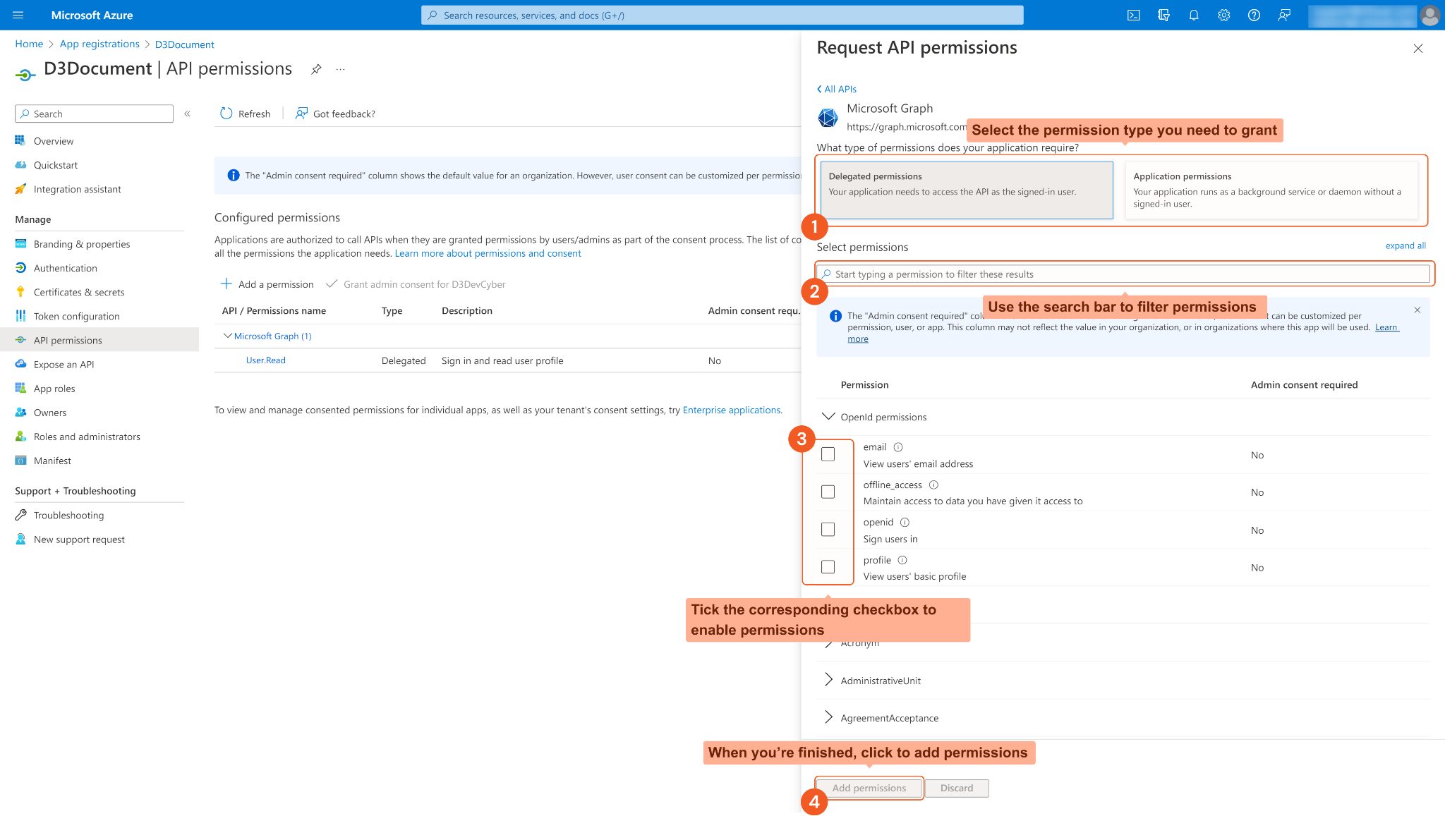 Some permissions may need to be granted admin consent for your directory (d3uat in the sample screenshot) to use. Ensure Grant admin consent for <Your Directory> is checked.