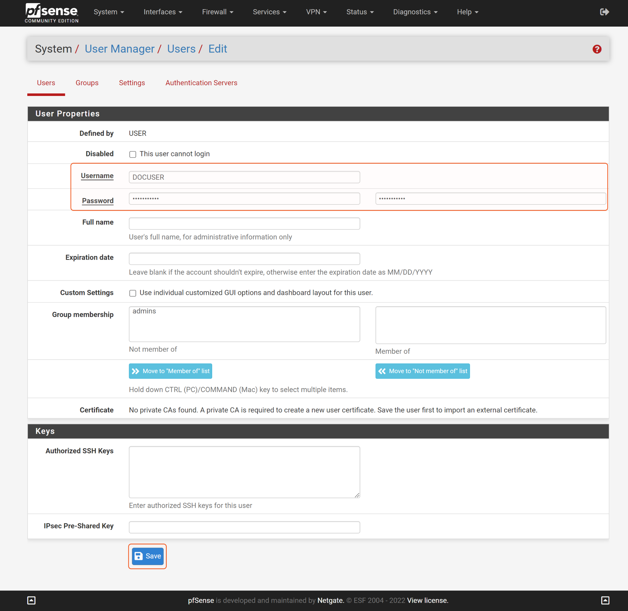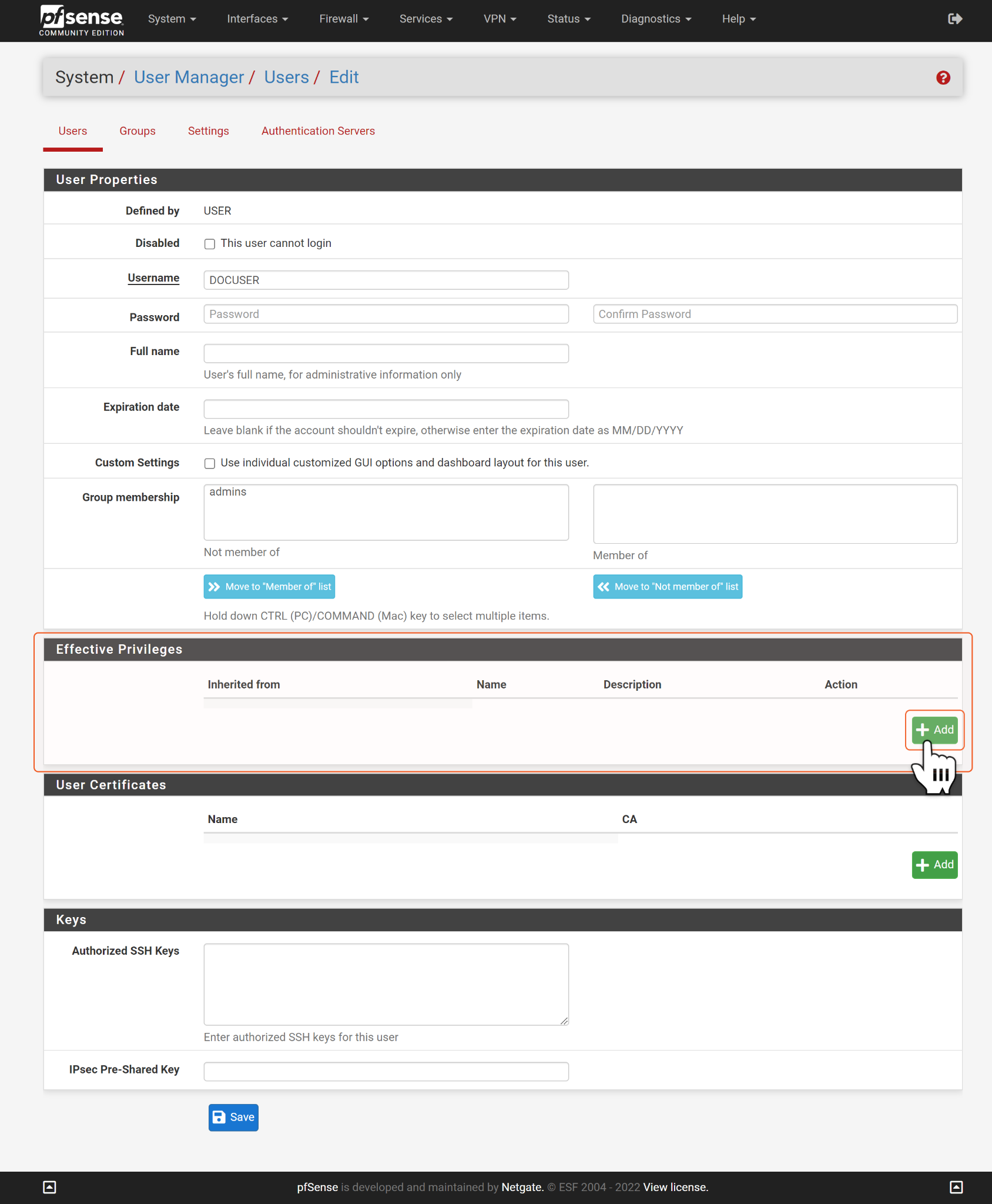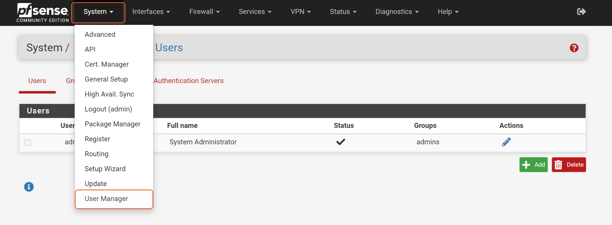 Log in to your PfSense console with an admin user account. Navigate to System > User Manager.
