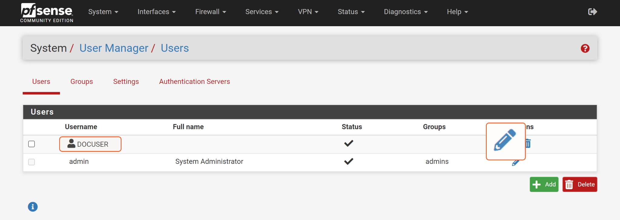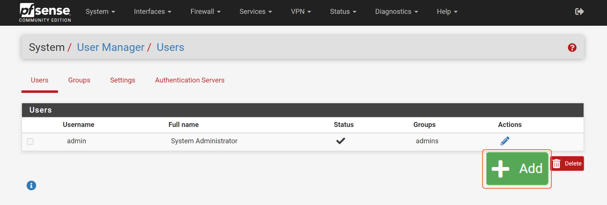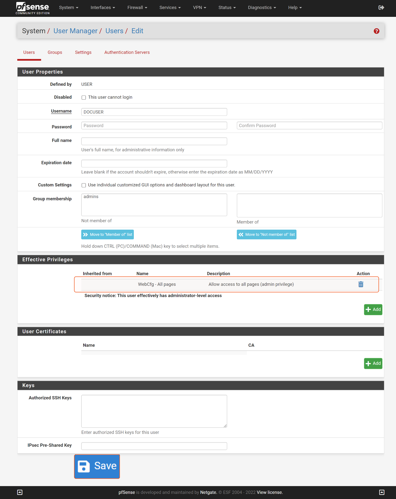Log in to your PfSense console with an admin user account. Navigate to System > User Manager.