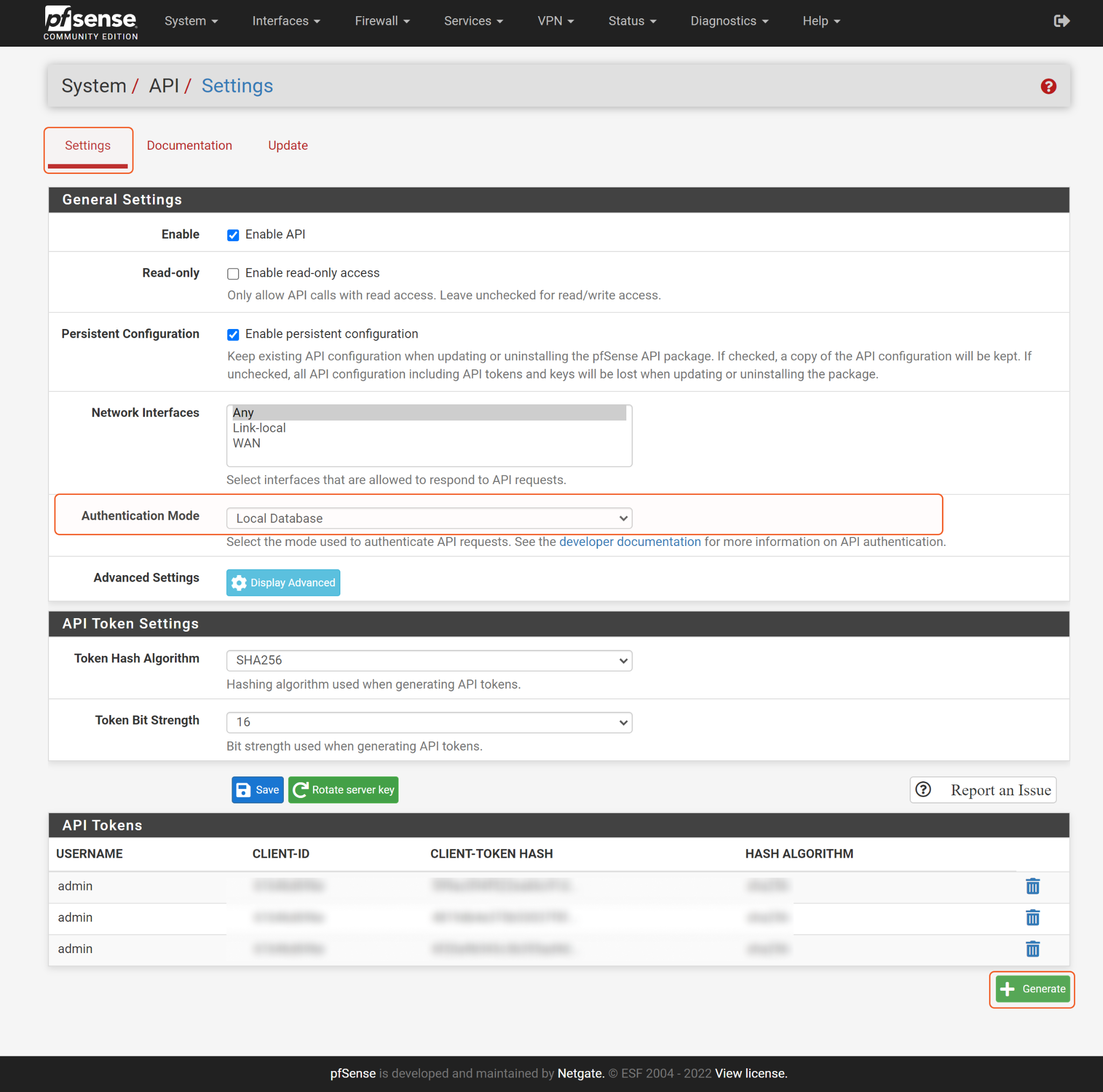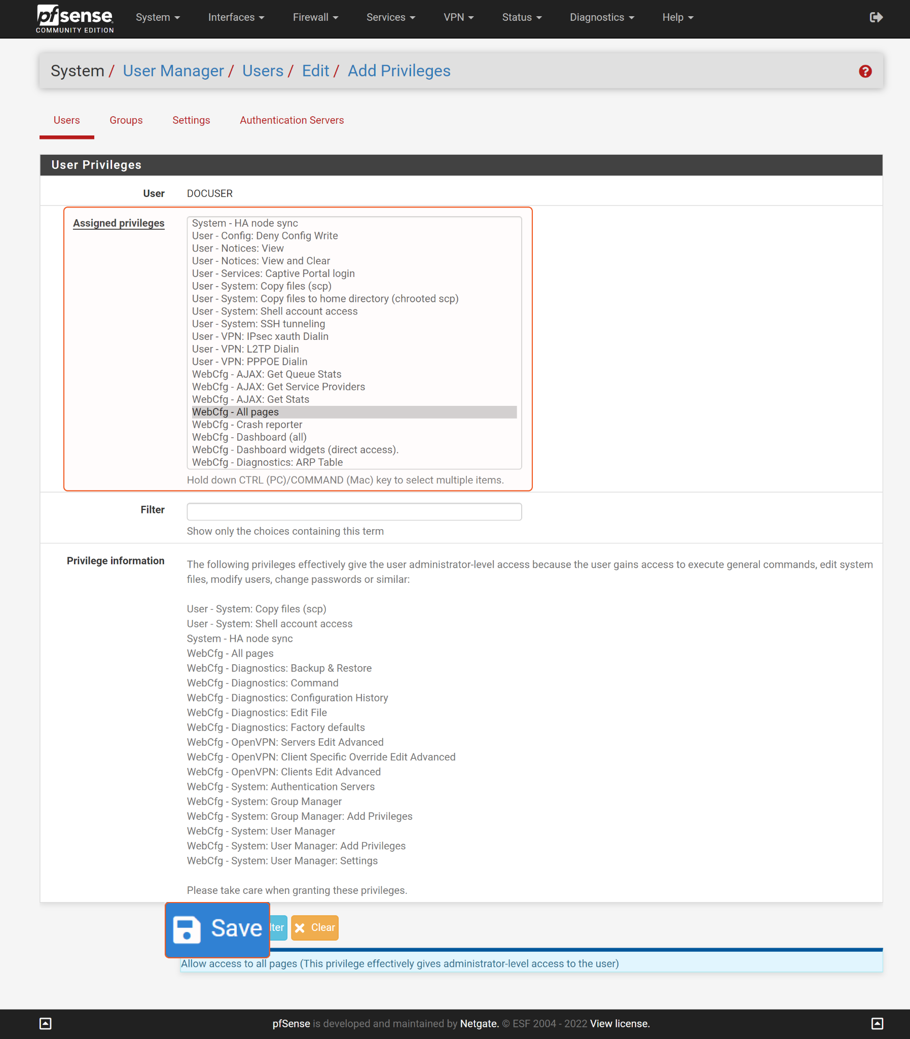 The PfSense API uses the same privileges as the PfSense webConfigurator. Therefore, the command permissions are inherited from the user account’s role. Users need to configure their user profile from the PfSense console for each command in this integration. See User Management and Authentication from PfSense’s documentation for more about managing user privileges.
