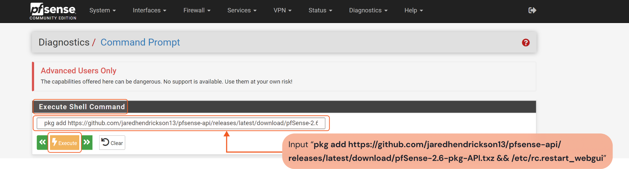 Click the Execute button to install the API package, then restart the web GUI.