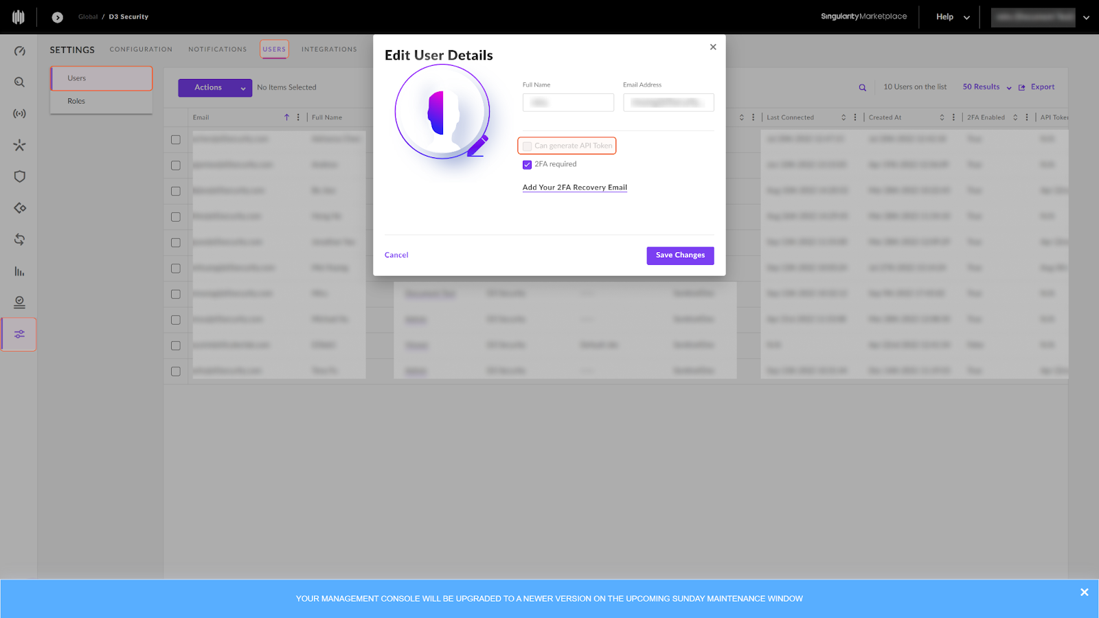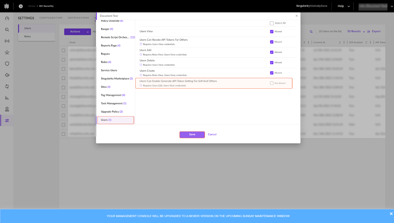Under Users, grant the “Users Can Enable Generate API Token Setting For Self And Others” permission, then click Save.