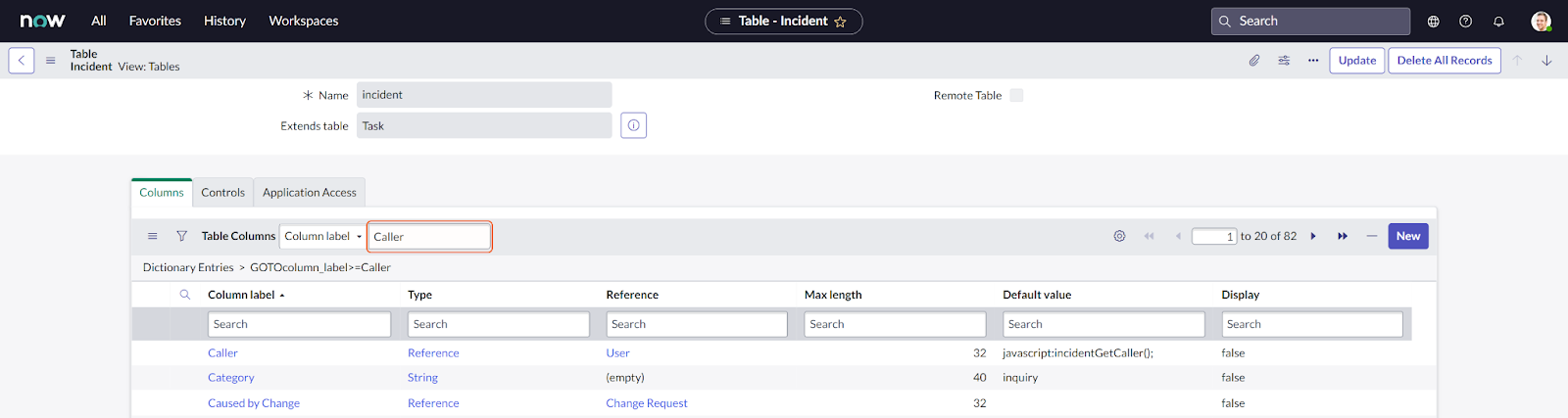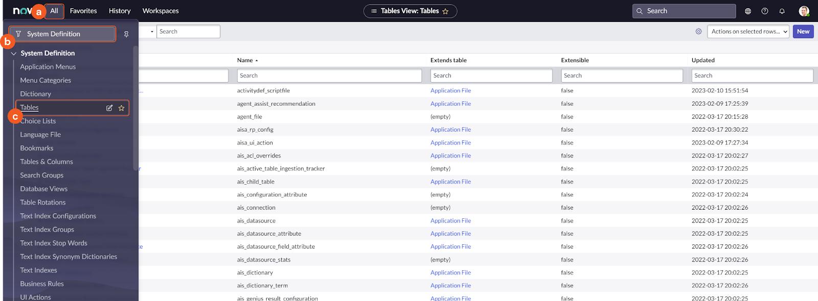 In ServiceNow, navigate to All > System Definition > Tables and select the desired table.