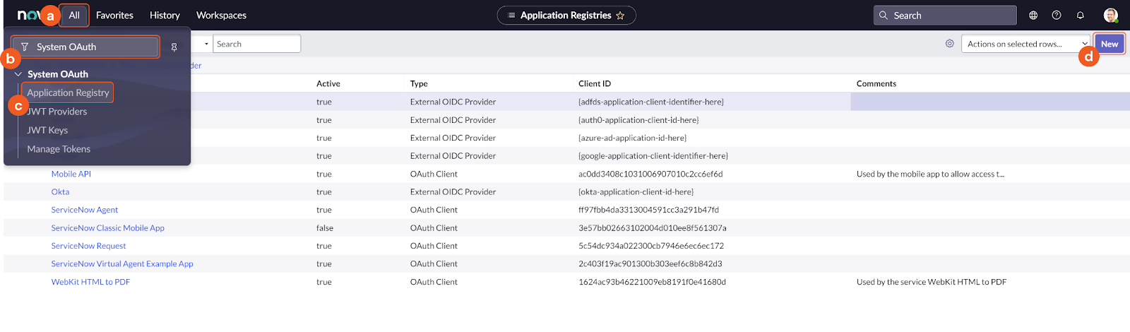 Select All from the top navigation bar. Type System OAuth into the filter search bar and select Users under Application Registry. Click New to add an application registry.