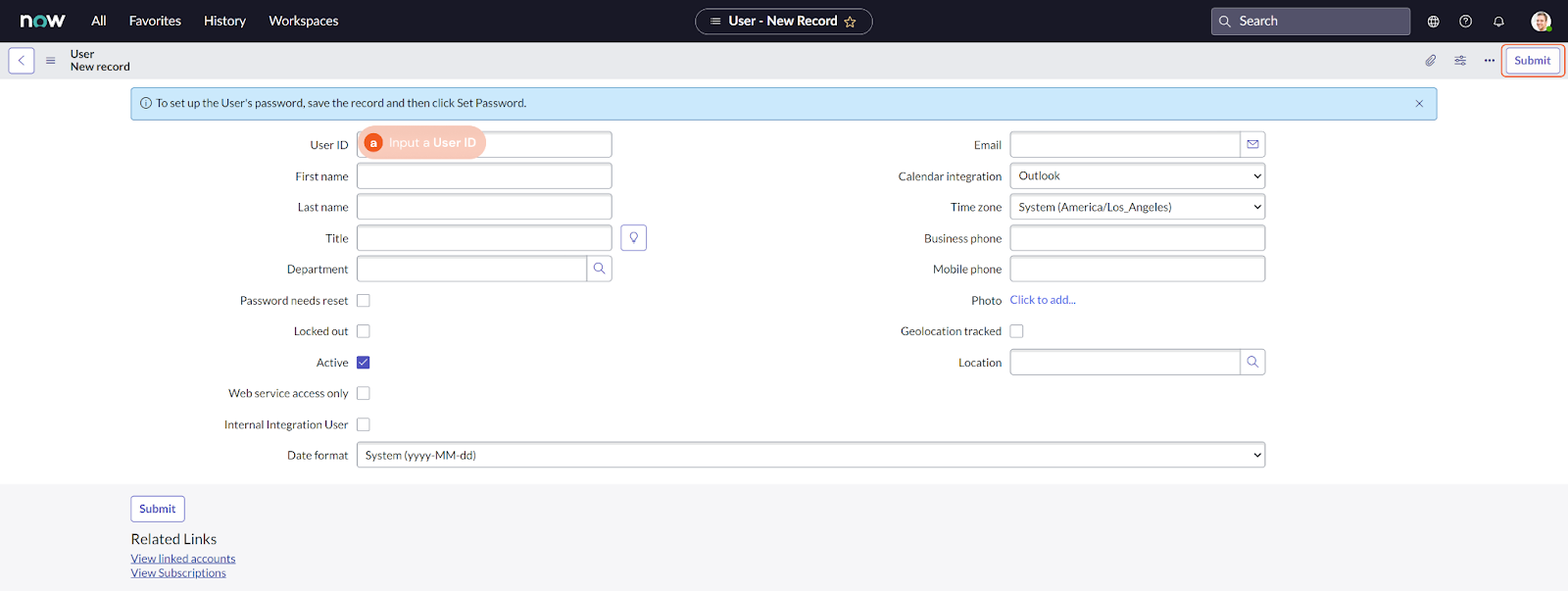 Enter a User ID and other required fields, then click Submit.