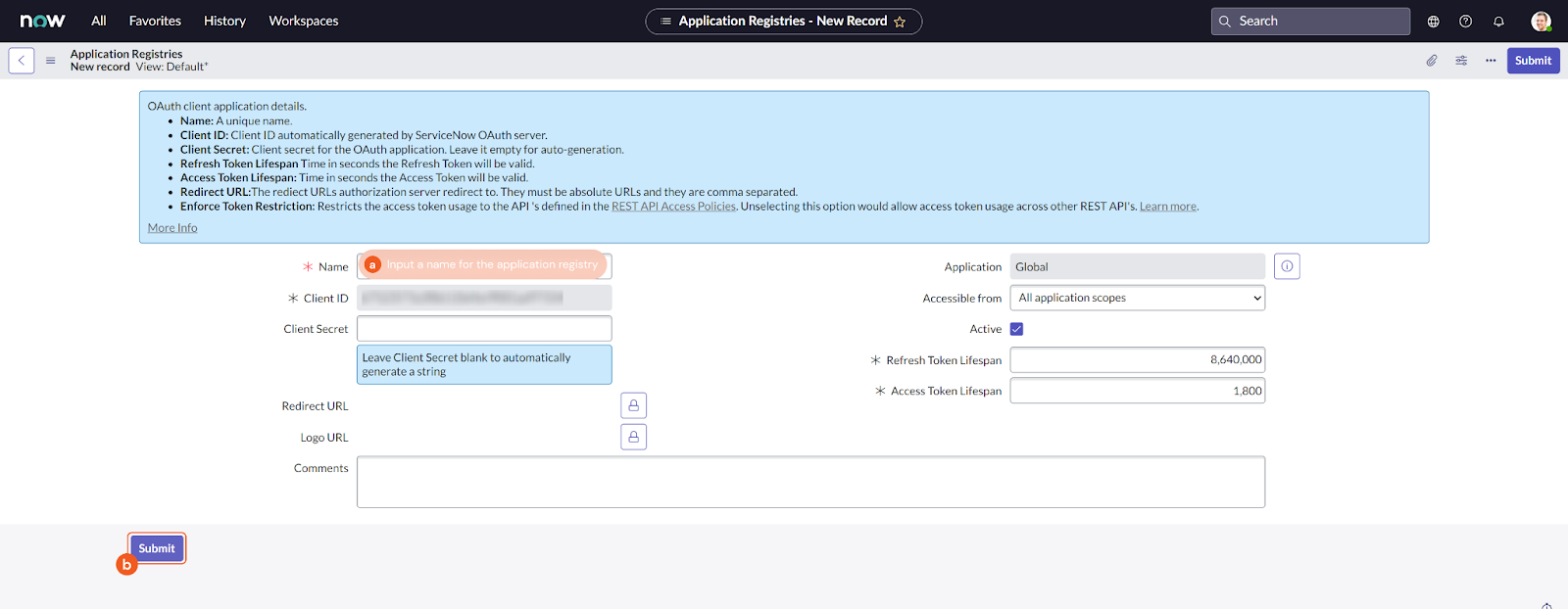 Name the new registry and click Submit. You do not need to manually edit the client ID and secret, these fields will be auto generated.