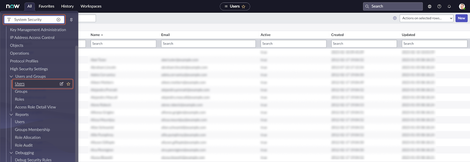 Select All from the top navigation bar. Type System Security into the filter search bar and select Users under Users and Groups. Click New to add a new user.