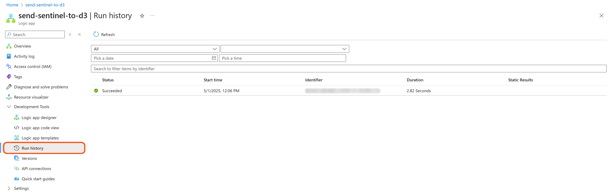 Navigate to the Run history submenu item on the left to verify the workflow execution.