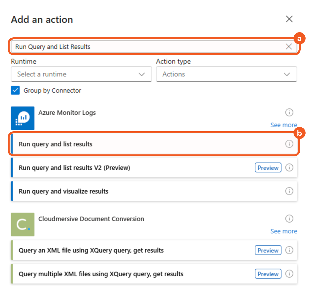 Search for the Run query and list results action from Azure Monitor Logs using the search bar, then select the matching result.